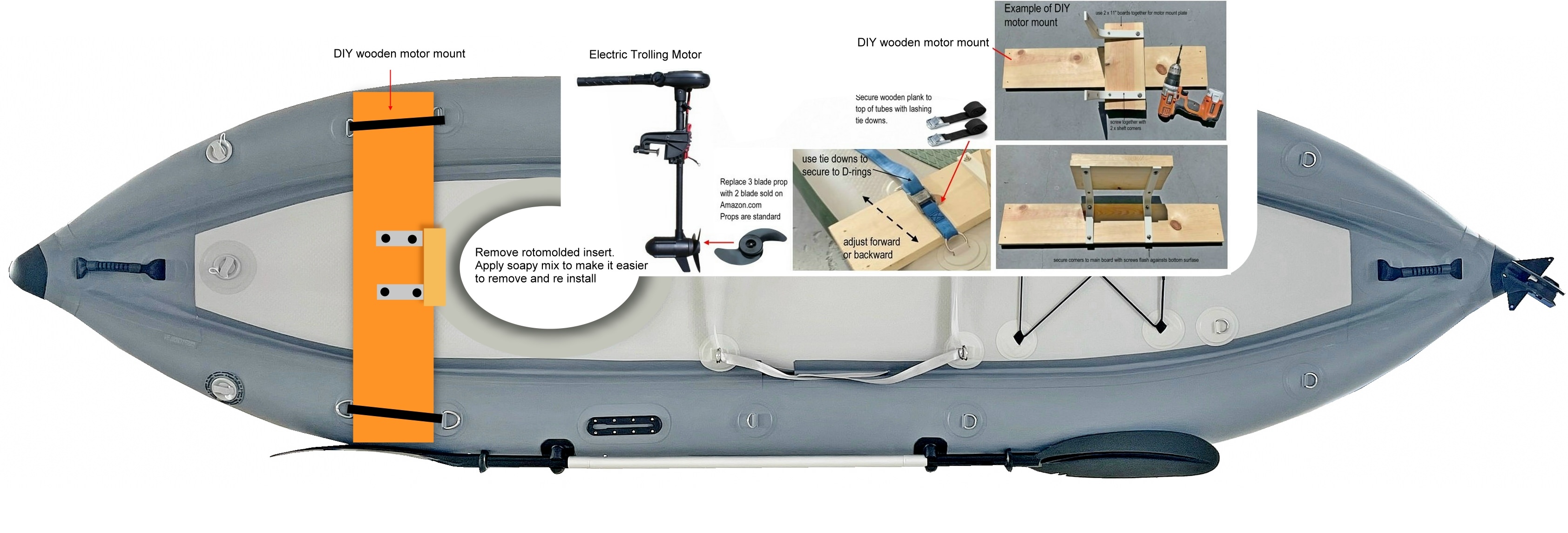 For those who want extra power on the water, four strategically placed D-rings on top of the tubes allow you to set up a simple DIY electric motor mount. Just use an 8" wide plywood board secured with lashing tie-downs, then attach a vertical motor plate either on the side or through a cut-out in the floor. Full instructions are available under the Attachments tab.
