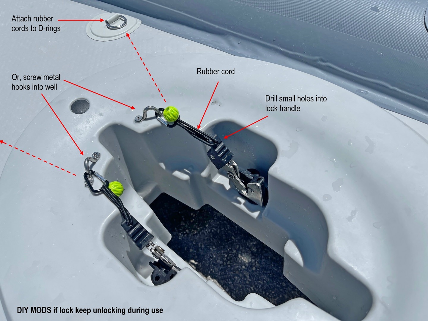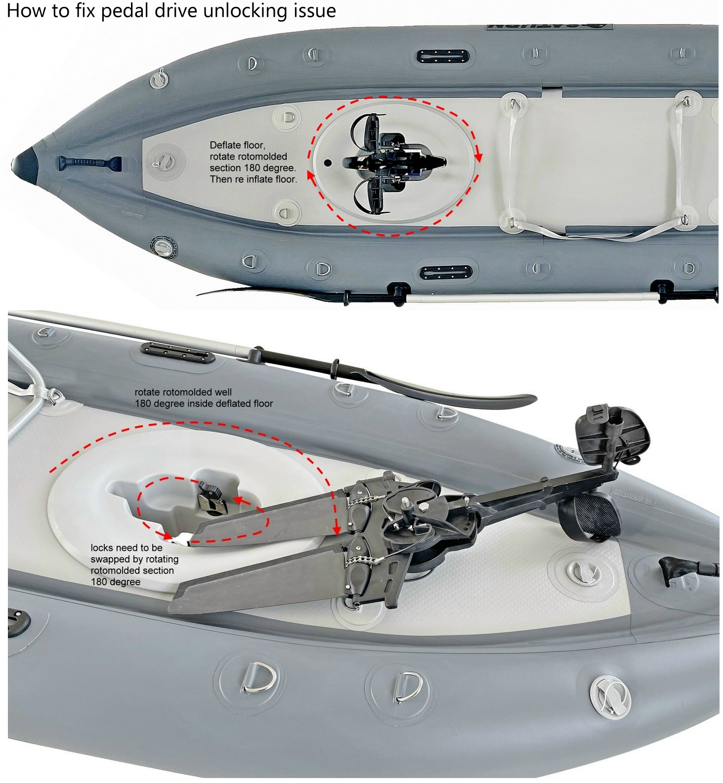 - Ensure the black dot on the pedal well faces backward (towards you). If it's not aligned, deflate the floor section, rotate the rotomolded well part 180 degrees, and re-inflate to fix the unlocking issue.