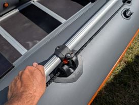 Transporting the boat is simple thanks to durable handles at the front and rear. A strong lifeline runs along both sides for added safety, while heavy-duty composite D-rings on the bottom allow for easy trailer attachment. There's even a drain valve on the transom to remove water quickly after use. And when it's time to pack up, one-click oar system makes it quick and convenient.