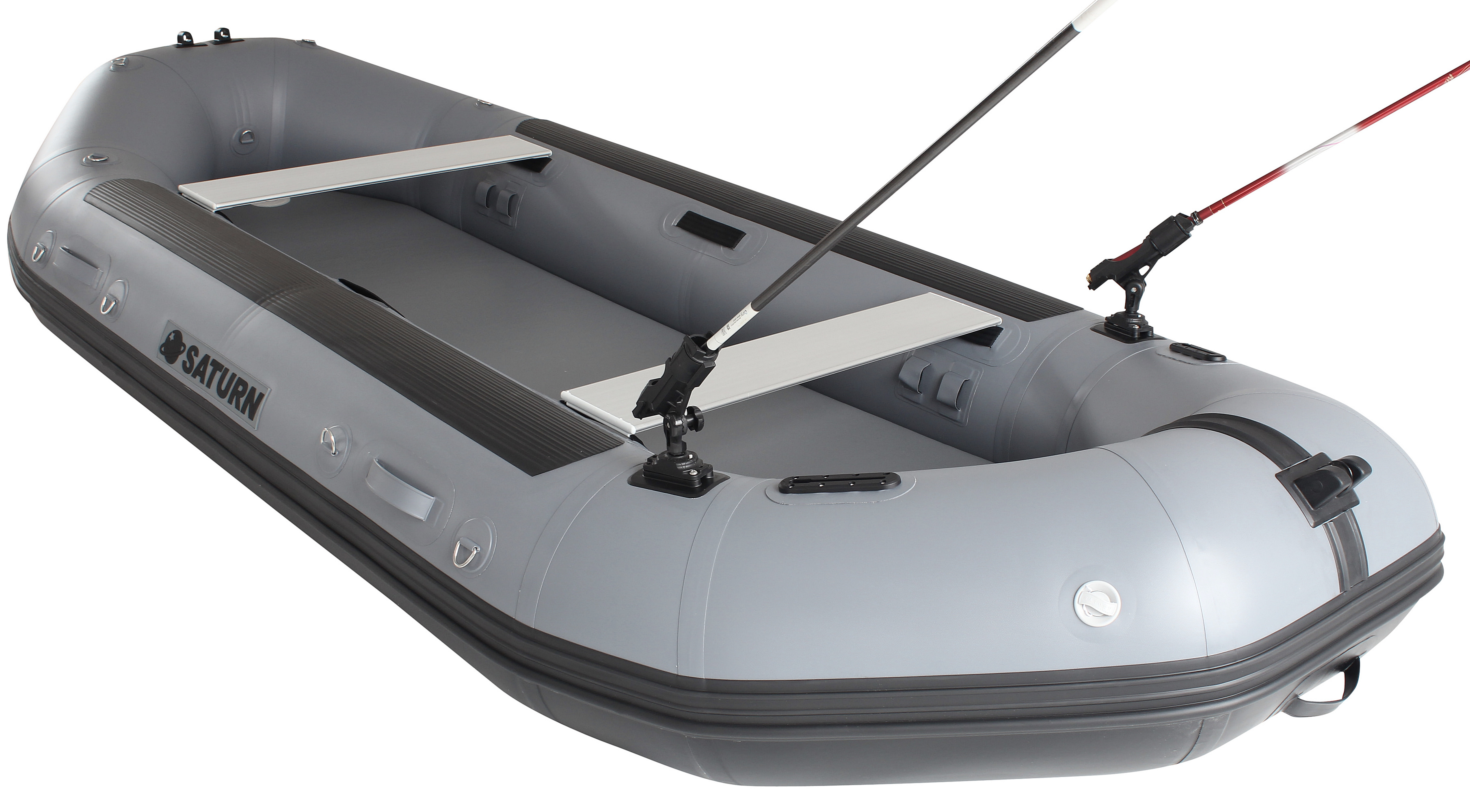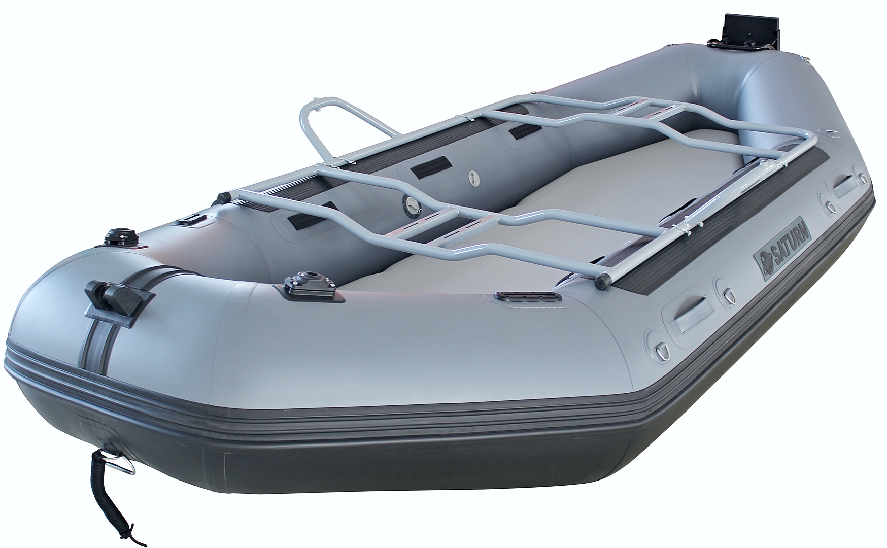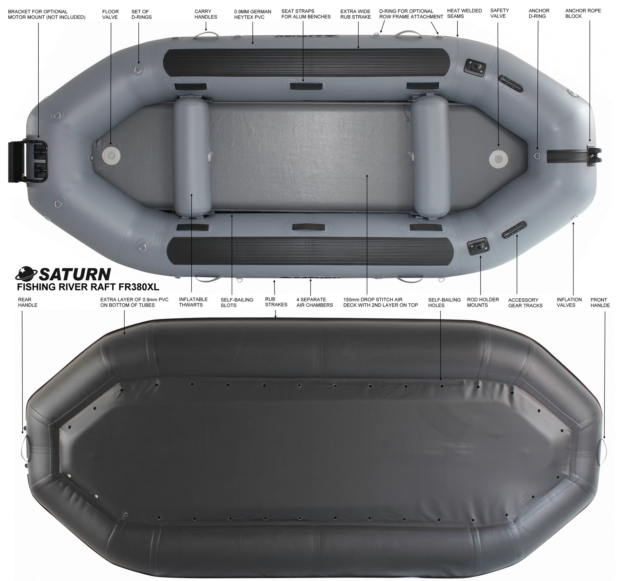 Saturn extra heavy-duty fly fishing raft FR380XL excellent for weekend white water river explorations and fly fishing. Commercial Grade FR380XL rafts features additional layers of PVC glued on a bottom of tubes, and extra wide rub strakes on top of tubes. That makes FR380XL river raft ideal for shallow and rocky bottom rivers. Large rub strakes on top of tubes and D-rings along hull are designed for optional rowing frame installation, turning it into a versatile fly fishing machine.