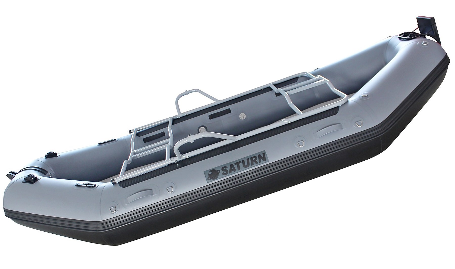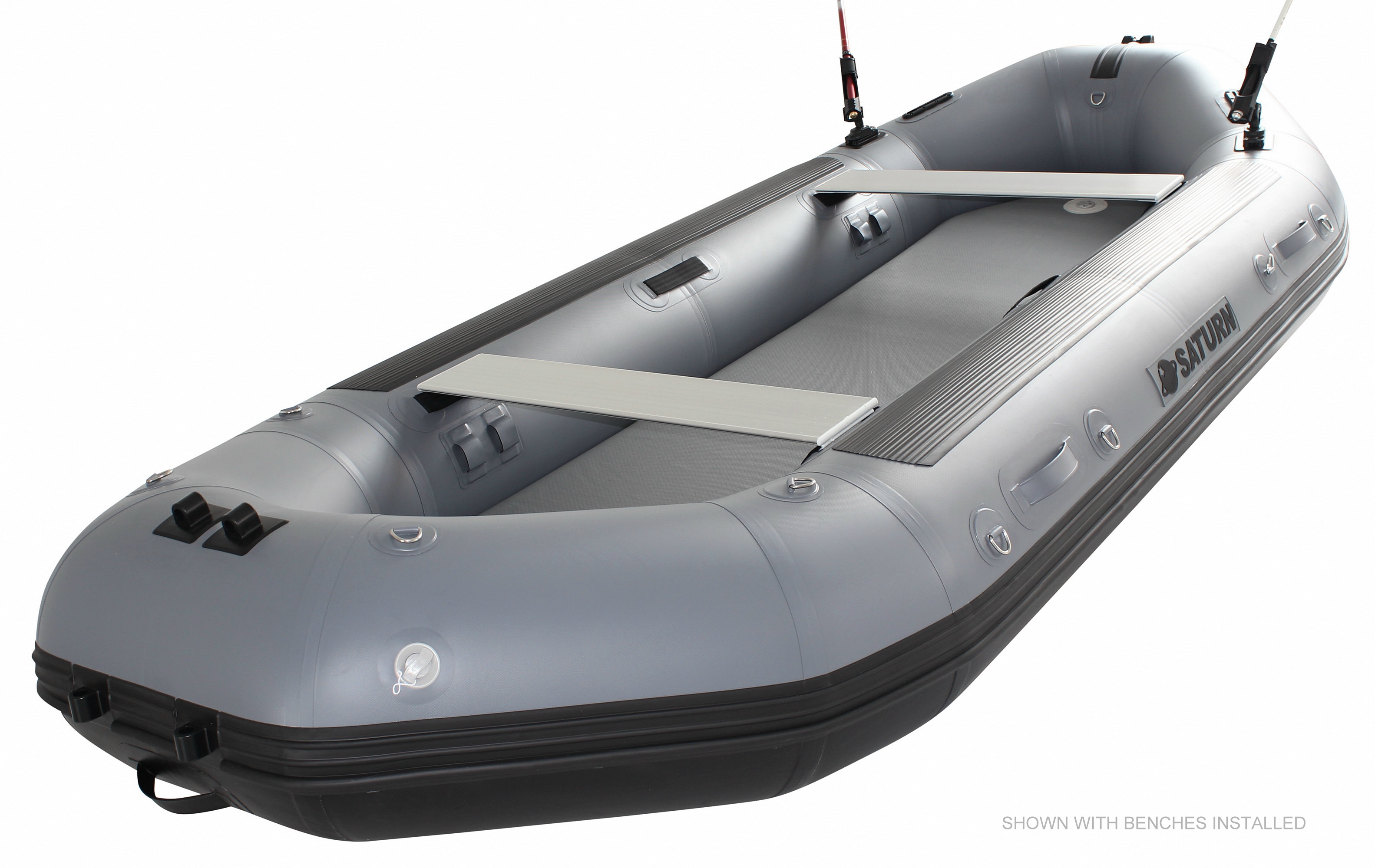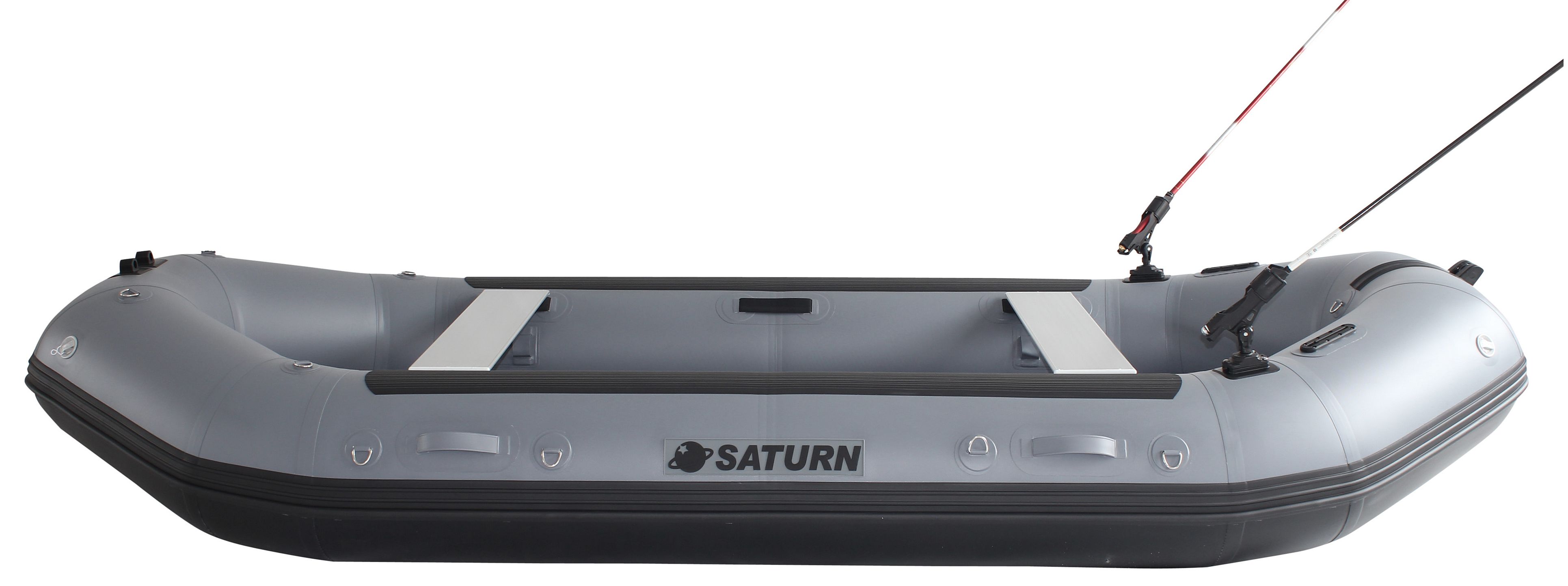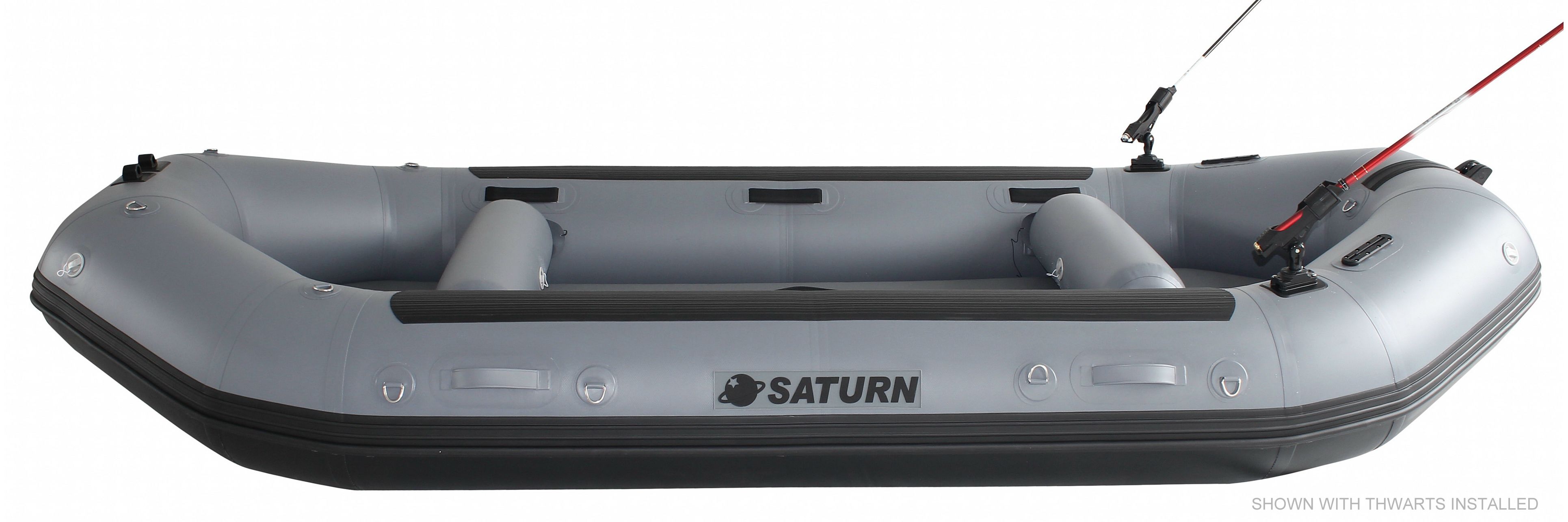 Saturn FR380XL river raft features attachment points for optional motor mount and can take up to 2HP outboard, or electric trolling motor. Accessory tracks on both sides can be used for optional fishing rod holders, fish finders, cup holders and more.