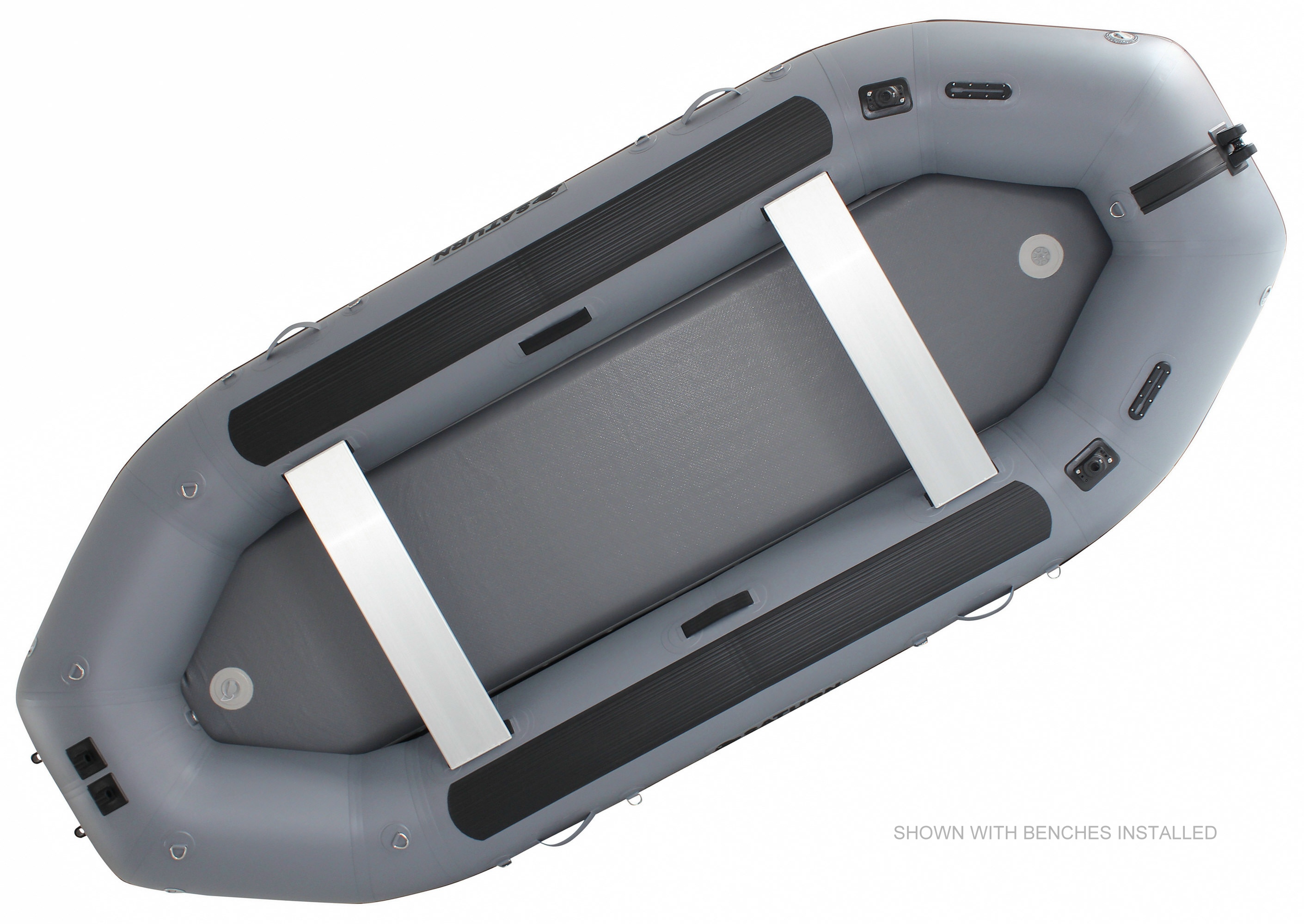 Set of D-rings on sides of tubes designed for optional rowing frame attachment. But, raft does comes with 2 removable aluminum benches, that can be used as a primary sitting option. Folding fishing chairs can also be bolted to benches if needed. Make sure to protect drop stitch floor from punctures with rubber or vinyl carpet or yoga foam mat.