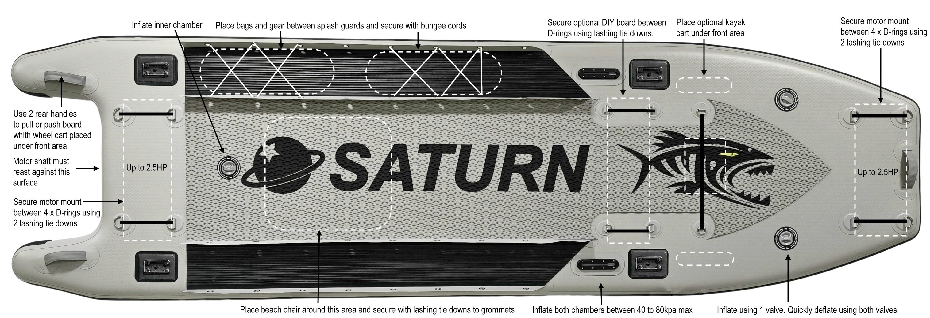 In its simplest form, the XFSUP380 is a wide, stable SUP that is comfortable enough to walk on and large enough to carry two to three people. For a more relaxed setup, one or two beach or lawn chairs can be strapped securely between the splash guards using optional lashing tie-downs. Four tie-downs are required per chair. A zero-gravity lounger can also be attached using the splash-guard grommets.