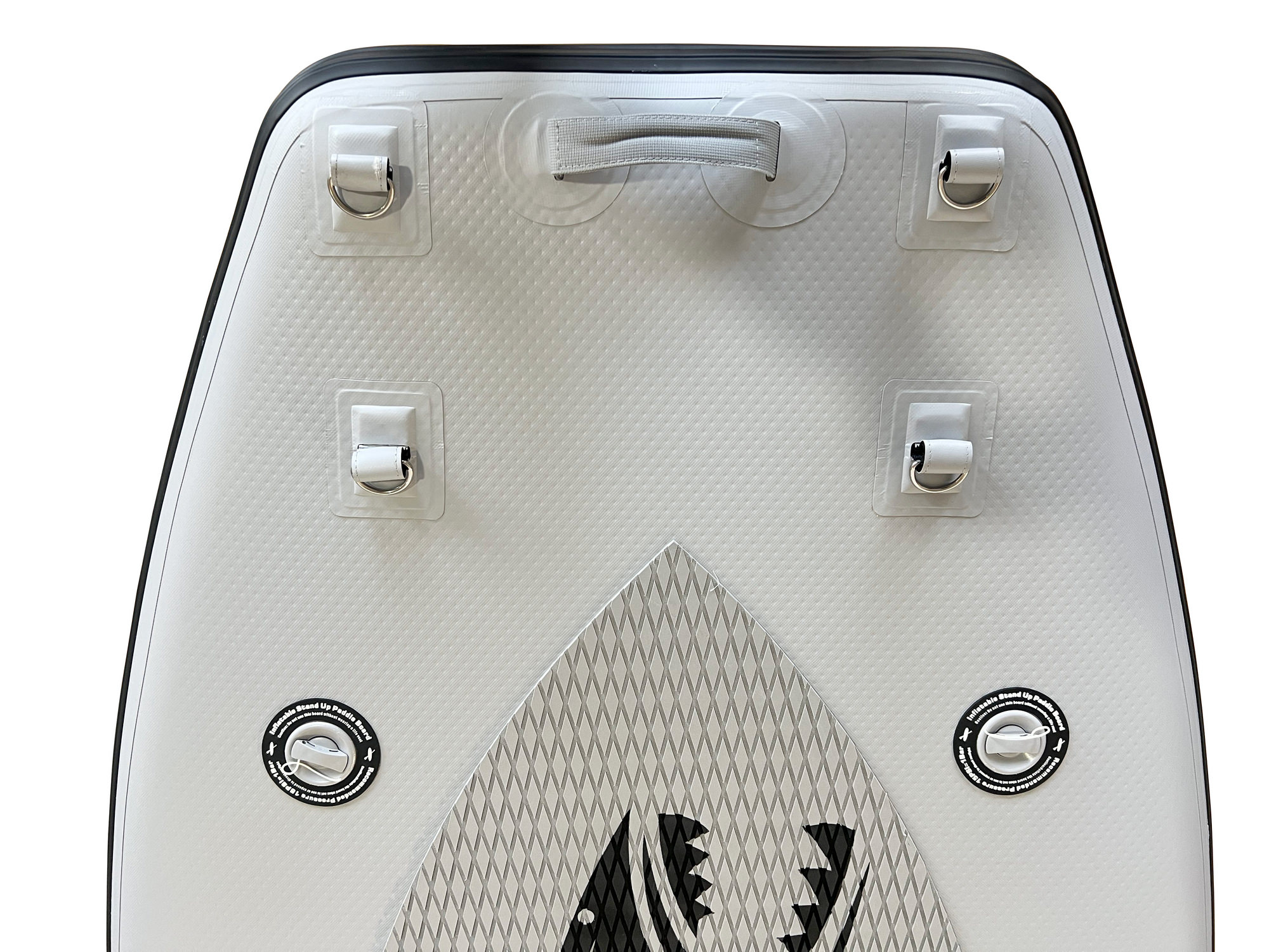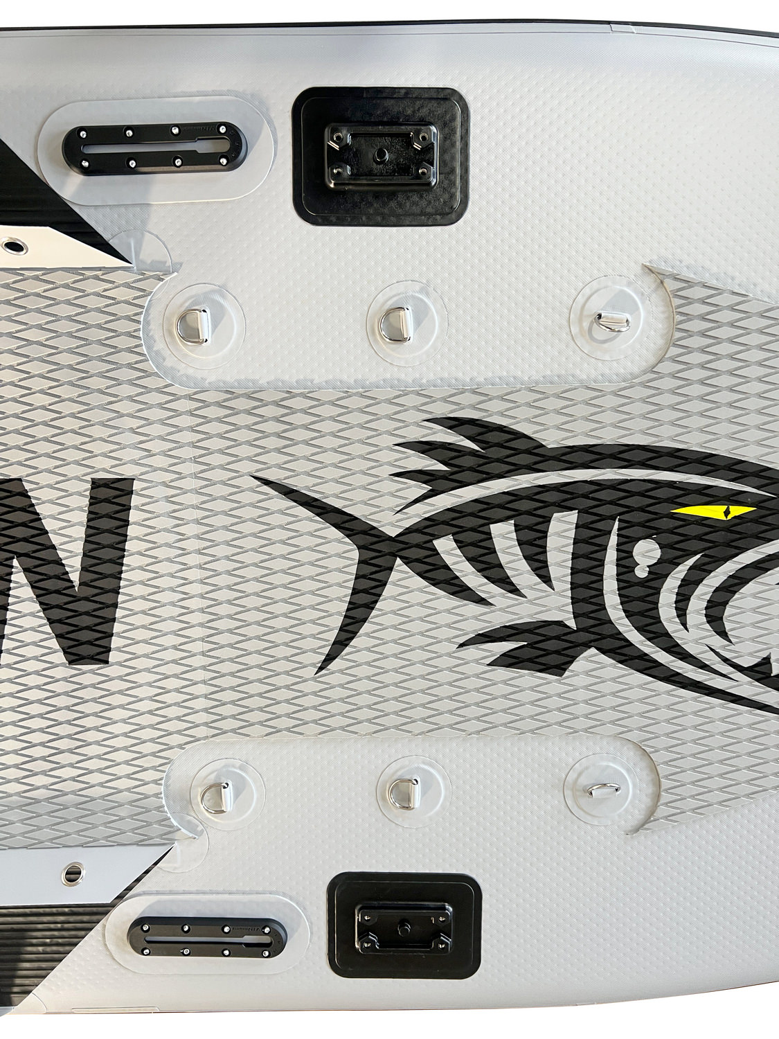 Meet the XFSUP380 — a uniquely shaped, extra-wide inflatable paddle board designed with the outline and functionality of a compact inflatable motor skiff. This new dual-motor-mount micro skiff features a redesigned blunt bow for even greater stability, plus added D-rings at the front and rear, giving you full flexibility when rigging motors or accessories. You can even pair it with a bow-mounted GPS-guided electric motor system, such as the AUTOBOAT SMART HEAD, for hands-free precision control and unmatched fishing convenience.