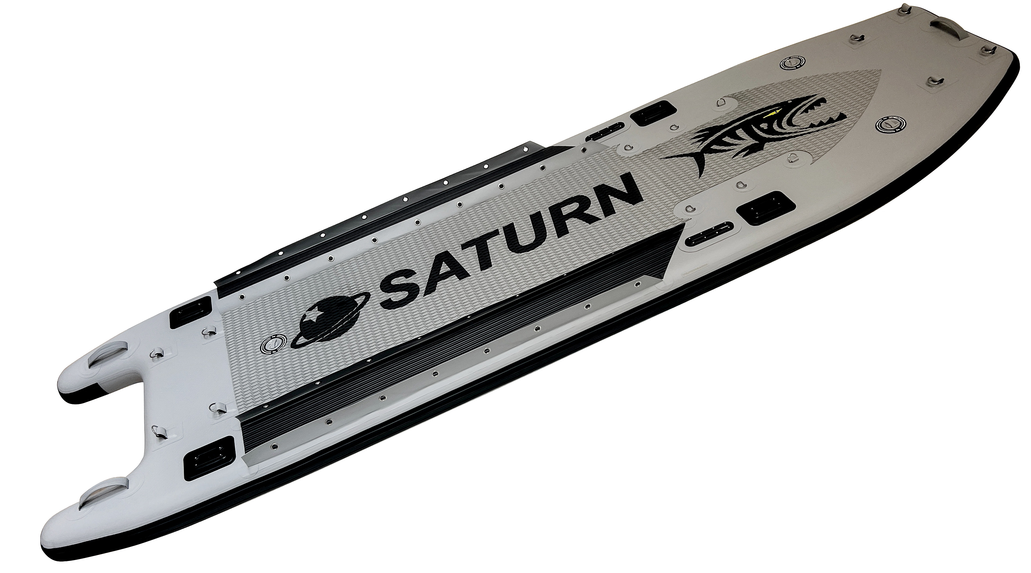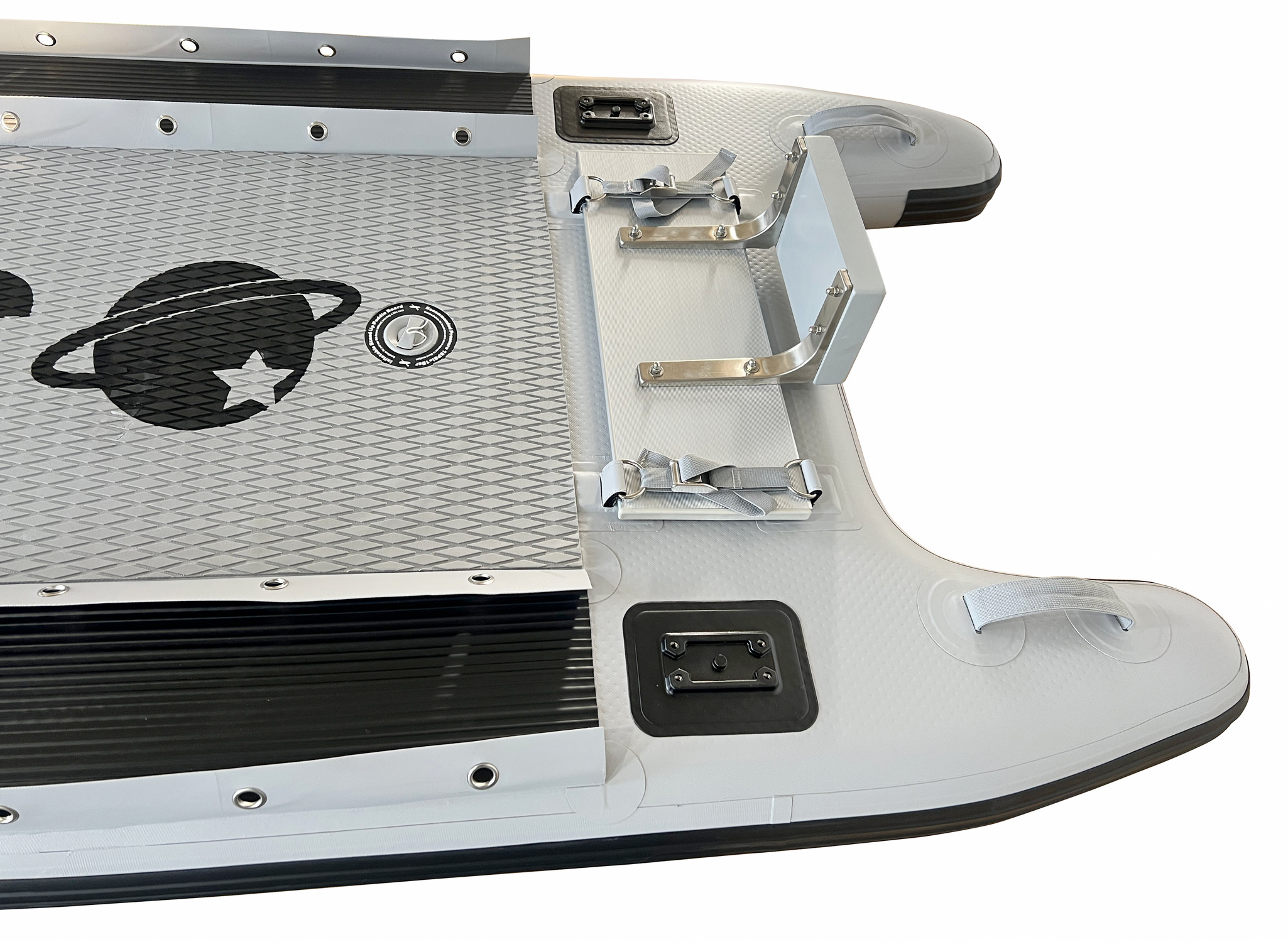 The updated XFSUP380 motor board layout includes four splash guards fitted with grommet holes on both sides, along with oversized rub strakes between them for added gear protection and storage capacity. This transforms the board into a highly adaptable platform that can be configured for stand-up paddling, outfitted with beach chairs, or even set up with a zero-gravity lounger.