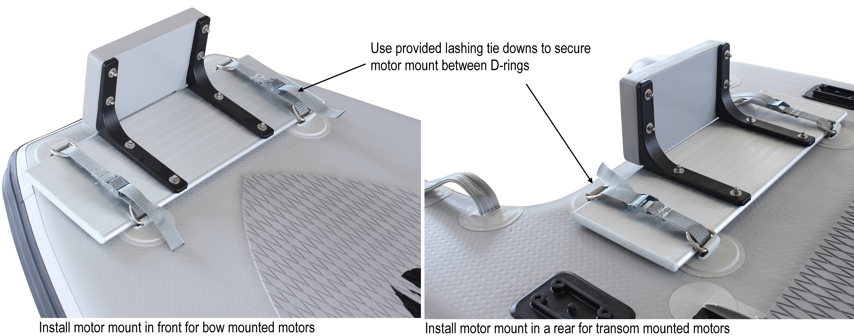 A motor mount can be attached to the set of four rear D-rings using two lashing tie-downs. The board supports electric trolling motors or small gas outboards up to 3 HP, turning it into a compact and capable micro skiff. The six forward D-rings allow easy DIY installation of a leaning post or stand-up frame.