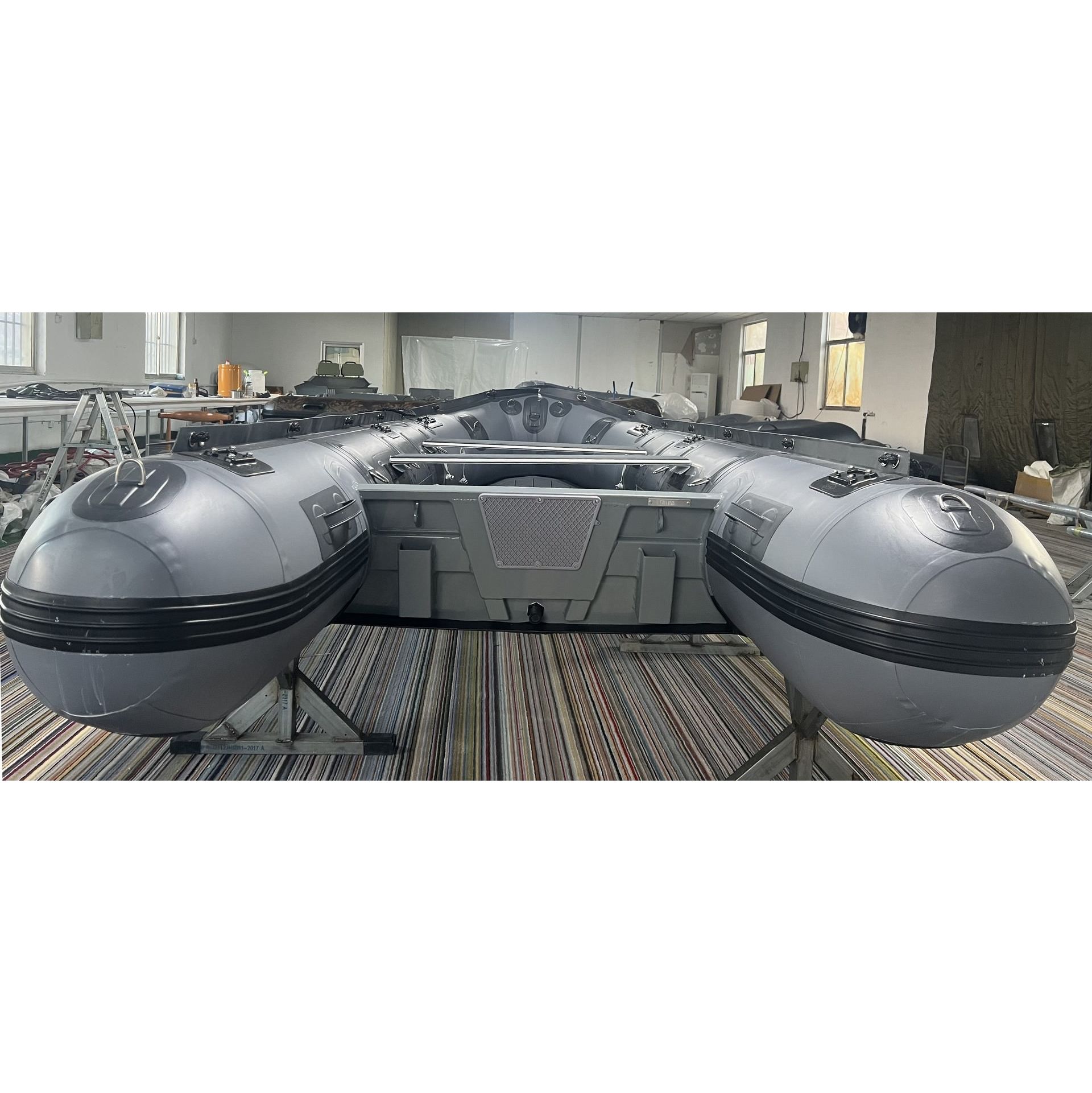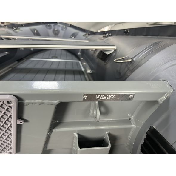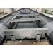 Manufacturer sample of new type of heavy duty inflatable boat with aluminum transom. Boat features numerous D-rings, multiple rod holder patches, aluminum floor with tracking protection. Extra wide rub strake protector along tube bottoms and keel.