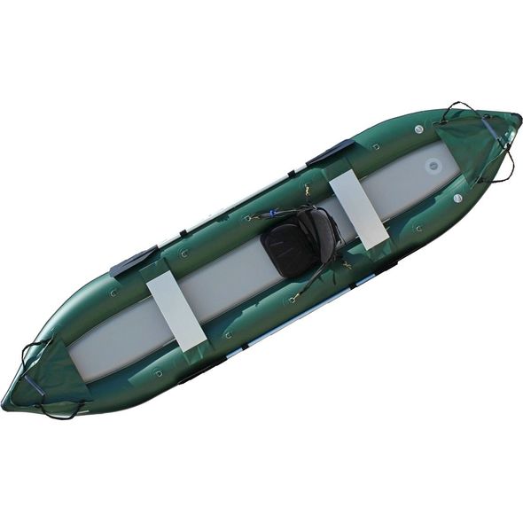 The OFK396 features a catamaran-style hull with 4 self-bailing drains, so any water that splashes in drains out fast. Its 150 mm thick drop-stitch floor—the same rigid technology used in premium paddleboards—delivers rock-solid stability for standing casts or reeling in your biggest catch.