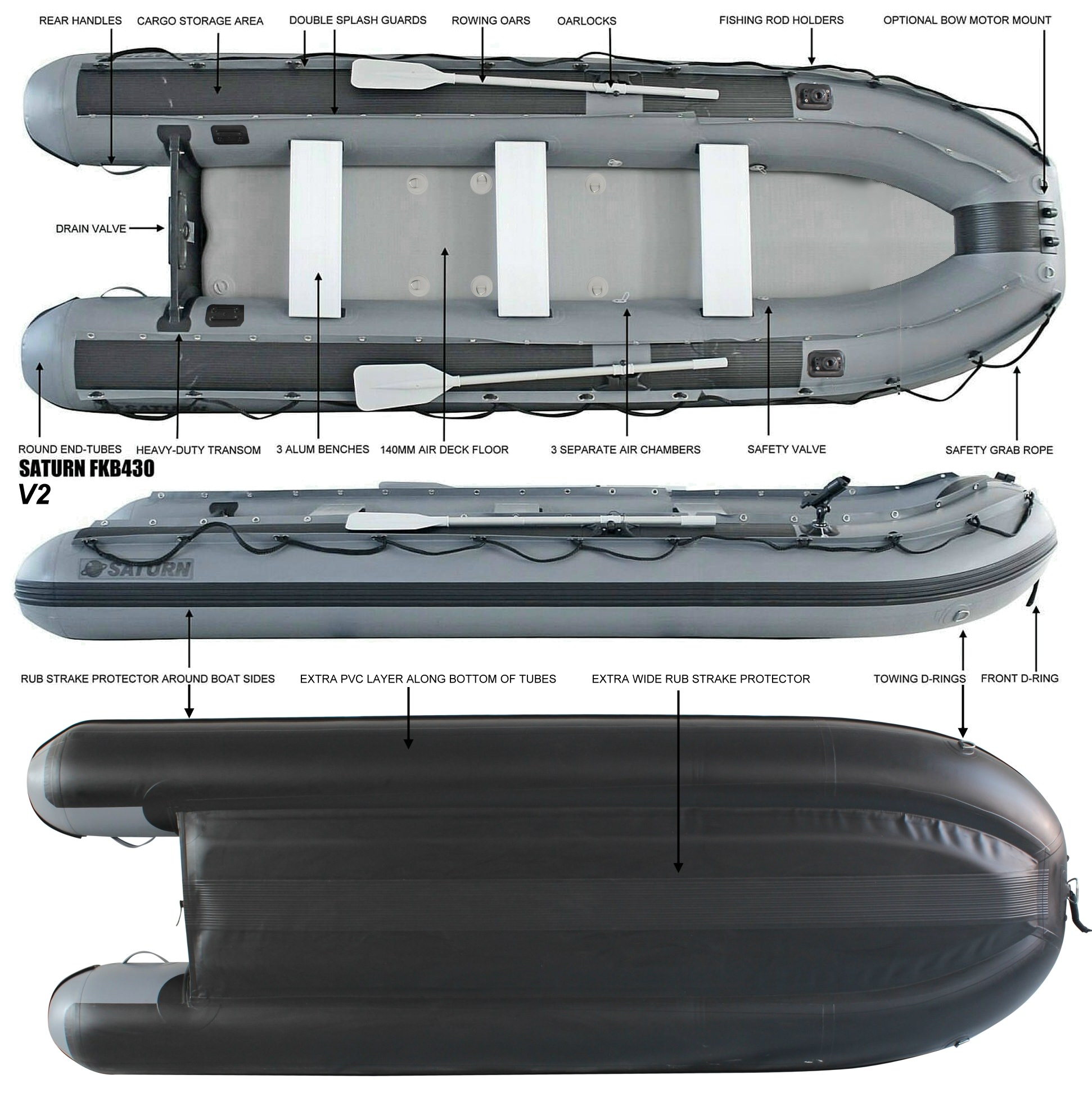 Introducing the Saturn 14' Heavy-Duty Fishing Inflatable KaBoat™ FKB430, engineered for unparalleled performance on the water. The FKB430 is the latest addition to our esteemed extra heavy-duty series of fishing inflatable boats, meticulously crafted with added features to elevate your fishing experience to new heights. With a narrow hull profile akin to our renowned FB boats, this model ensures swift navigation with smaller outboard engines, effortlessly harnessing the power of 5-6HP motors for optimal performance.