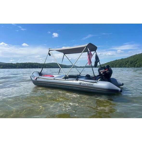 Make your inflatable boat riding experience even more comfortable and protect yourself from harsh ultraviolet rays with a Saturn Folding 2-Bow Bimini Top Canopy. No need to use screws. Easy assembly with pushpin. Breaks down into storage bag for easy storage and portable transportation.