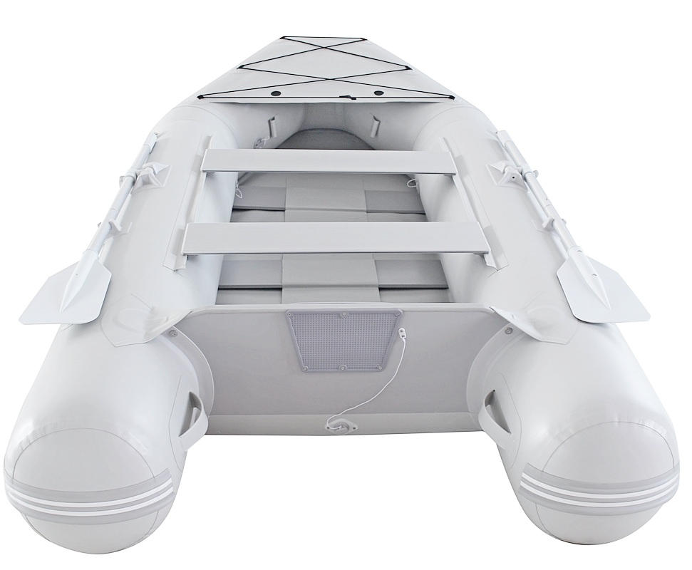 Saturn slatted floor SB290 dinghy boats features large round end tubes, bow cover area with bungee cords for storage, and holes for rod holders. Unique feature of SB290 boat is also sliding benches, that allows more convenient positioning of benches inside boat. You can even put 2 benches next to each other, to increase seating area. Or easily remove bench, or adjust position for best rowing location.