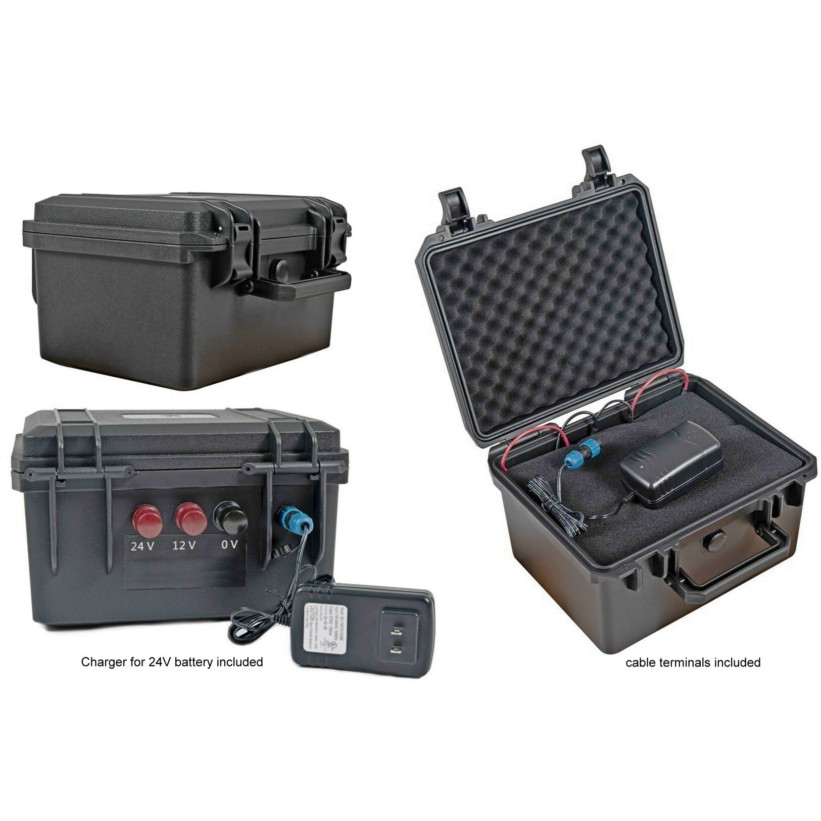 For 12 or 24V batteries. Charger included for 24V battery.