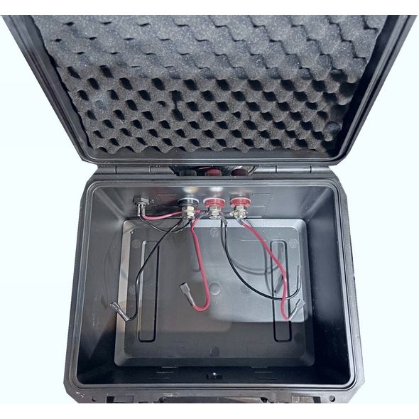 Small, portable dry box for 12V or 2x 12V 12Ah batteries. Batteries are NOT included. Box filled with foam protection that can be adjusted or removed to fit batteries.