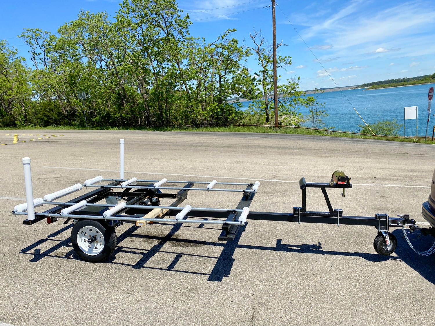 I finished the car-top rack with roller rack made from electrical EMT, plumbing PVC, and a remote controlled 12vdc winch. It worked great. But it would not take the boat-with-motor. And installing/removing the rack assembly for each outing was difficult and very time consuming. I decided to give it up and build a trailer.