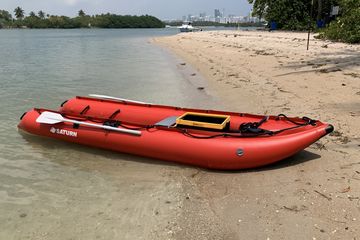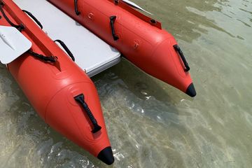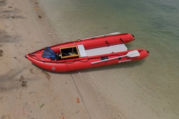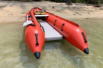 Based on popular KaBoat SK396 desing, this boat model is very much similar, except it does not have transom. Because, this particular mode was designed to be rowed to destination off shore, and then used as a diving or snorkeling platform. You can row it from a beach to reefs for scuba diving, or spear gun fishing. Divers or swimmers can exit or enter from rear of the boat, using conveniently installed handles. Also, great for swimmers, rowing, exercise and fun on a water.