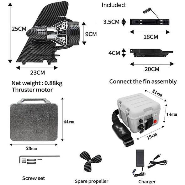 - Included: electric fin, 2 mounting adaptors, wrist remote controller, safety lanyard, lithium battery and charger.