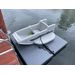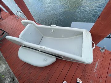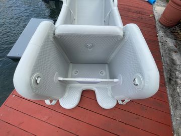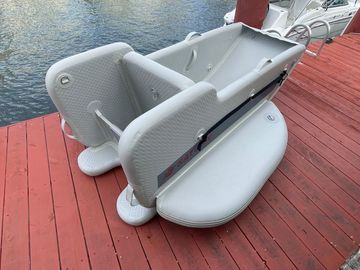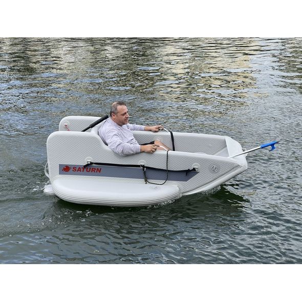 This is experimental watercraft. Idea was to have outboard motor 6 to 10HP attached to transom, with shaft locked to prevent its steering. When boat moves forward, it can be steered by tilting into direction you need to go. Special wings on sides of this boat acts as a rudder, creating friction enough to turn boat when its move fast enough.