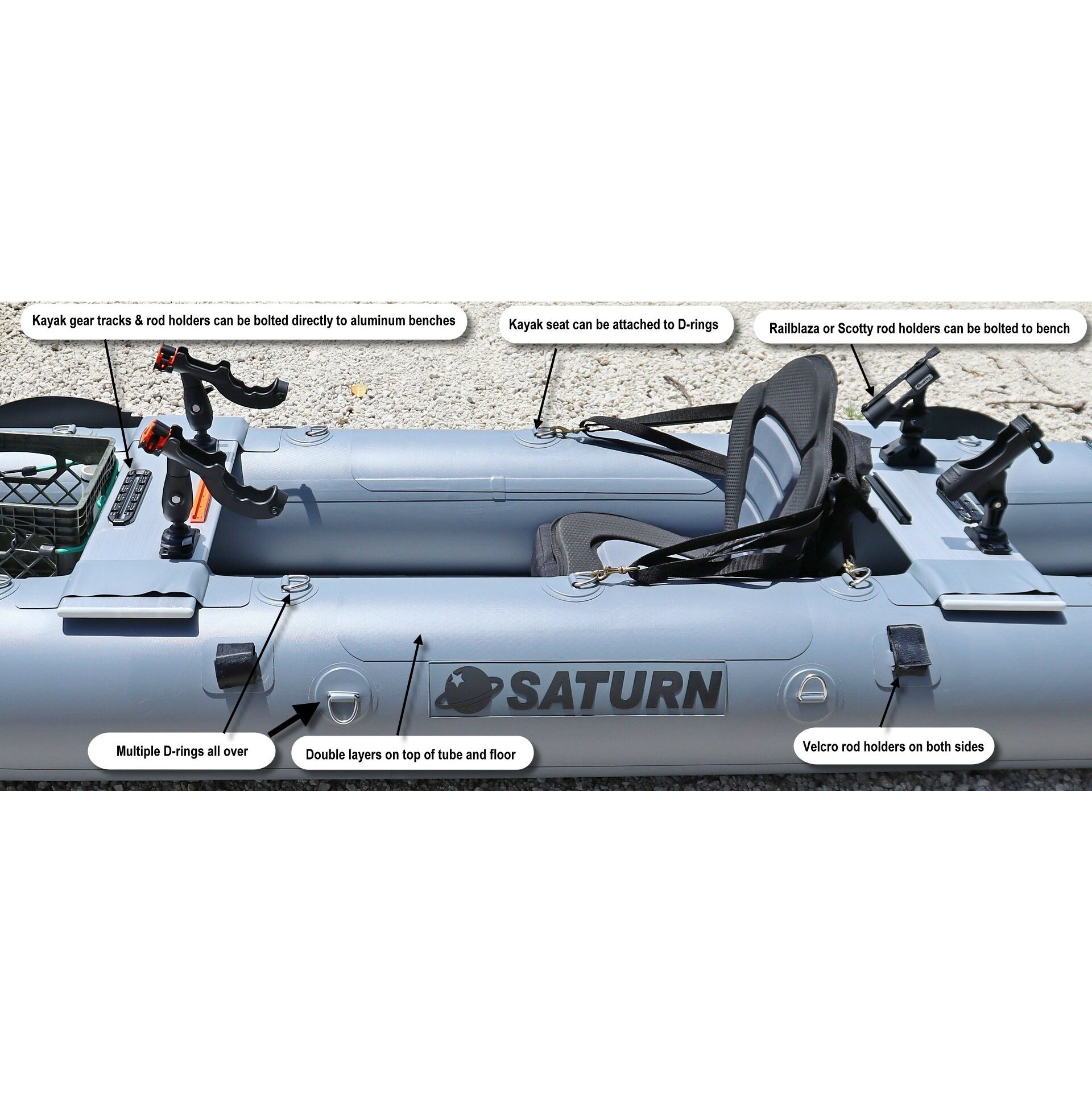 Crafted from heavy-duty 1100 Dtex German Mehler PVC, the FK396 offers the same exceptional durability as Saturn’s renowned inflatable boats and rafts. Its ultra-rigid 1.8mm double-layered high-pressure air deck floor provides outstanding stiffness when inflated, yet easily rolls up for compact storage. Additionally, the double-layered PVC fabric on top of the tubes in the cockpit area helps prevent damage from accidental fishing hook snags.