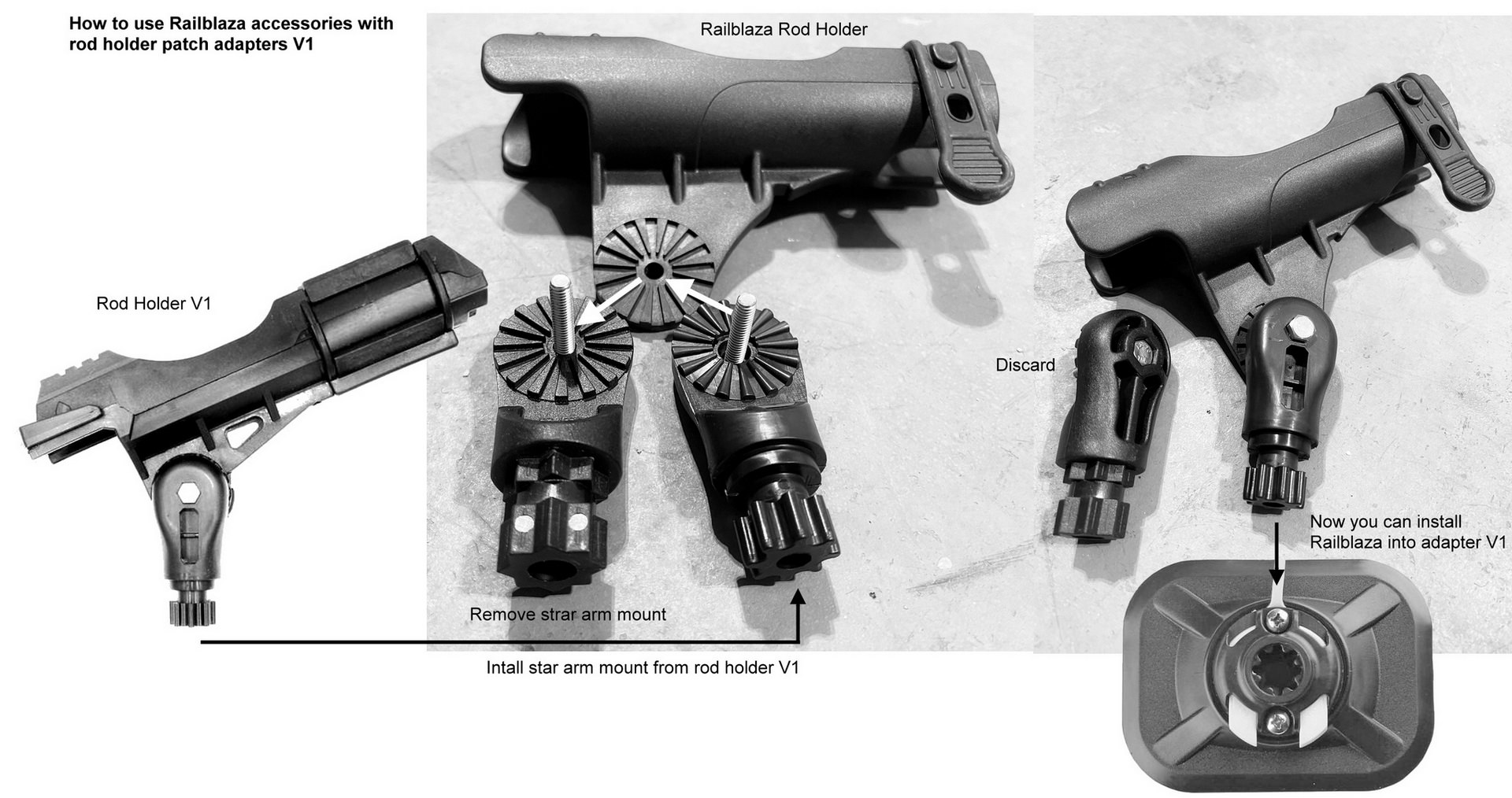 It could be possible to use Railblaza product on V1 adapter patches by purchasing V1 rod holder, and then swapping star mounting arm section on Railblaza products with V1 rod holder arm. Simply remove screws from Railblaza start mounting arm and install same from V1 rod holder. These can be swapped. See attachment for example.