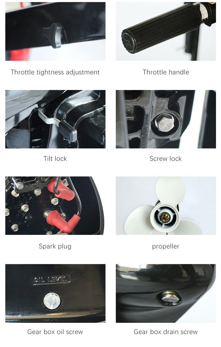 1. Please carefully read the manual and strictly follow the precautions to have a better experience. 2. Please measure the height of your boat before purchasing to ensure suitability for this product. 3. Please start the motor in the water. If the motor stops circulating water, please stop using it immediately and check the impeller of the water pump to see if the water outlet is blocked. 4. Please note that this product should use a mixture of two-stroke engine oil and 92 # unleaded gasoline. The running-in period of the new machine is 10 hours, during which the fuel ratio is 30L (7.93 gal) of gasoline to 1L (0.26 gal) of engine oil. After 10 hours, the ratio is 50 liters (13.21 gallons) of gasoline to 1 liter (0.26 gallons) of oil. 5. Please note that the emergency shutdown rope should be inserted when the outboard motor is started, and the other end should be wrapped around your wrist or belt. 6. Please do not drive too fast during the running-in period. After the running-in period, the gear oil needs to be replaced, and the second replacement time is about 100 hours or 6 months later. 7. Please do not leave this product outside until the cooling water is completely used up. Otherwise, water will enter the cylinder through the exhaust port, leading to engine failure. After cruising in seawater or turbid water, please clean the outboard motor with fresh water and cool the water channel with fresh water. The engine should be stored in a dry and well-ventilated place, and avoid direct exposure to sunlight. 8. If not in use for a long time, please thoroughly clean the gasoline in the fuel tank.