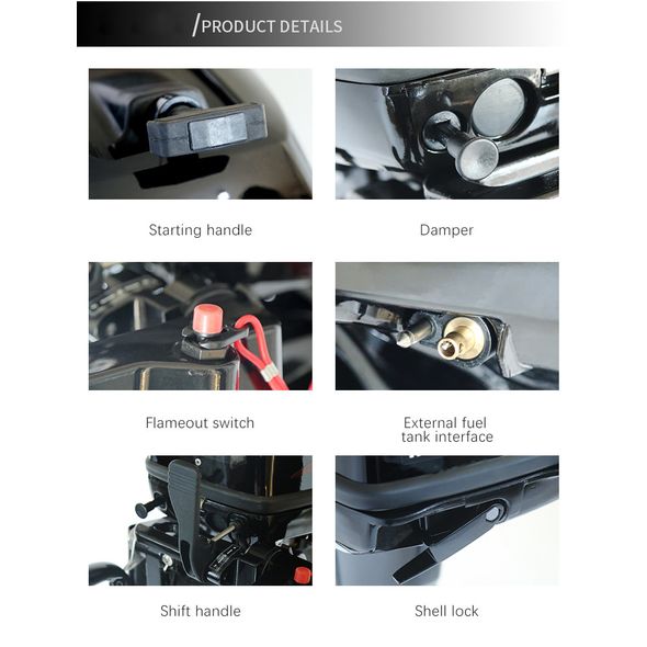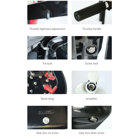 1. Please carefully read the manual and strictly follow the precautions to have a better experience. 2. Please measure the height of your boat before purchasing to ensure suitability for this product. 3. Please start the motor in the water. If the motor stops circulating water, please stop using it immediately and check the impeller of the water pump to see if the water outlet is blocked. 4. Please note that this product should use a mixture of two-stroke engine oil and 92 # unleaded gasoline. The running-in period of the new machine is 10 hours, during which the fuel ratio is 30L (7.93 gal) of gasoline to 1L (0.26 gal) of engine oil. After 10 hours, the ratio is 50 liters (13.21 gallons) of gasoline to 1 liter (0.26 gallons) of oil. 5. Please note that the emergency shutdown rope should be inserted when the outboard motor is started, and the other end should be wrapped around your wrist or belt. 6. Please do not drive too fast during the running-in period. After the running-in period, the gear oil needs to be replaced, and the second replacement time is about 100 hours or 6 months later. 7. Please do not leave this product outside until the cooling water is completely used up. Otherwise, water will enter the cylinder through the exhaust port, leading to engine failure. After cruising in seawater or turbid water, please clean the outboard motor with fresh water and cool the water channel with fresh water. The engine should be stored in a dry and well-ventilated place, and avoid direct exposure to sunlight. 8. If not in use for a long time, please thoroughly clean the gasoline in the fuel tank.