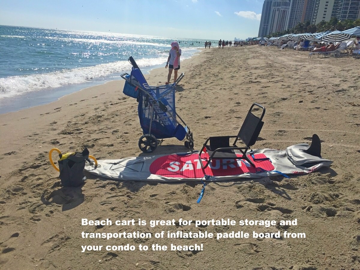 What if you live in a condo, and need easy way to store and transport your inflatable paddle board from house to the beach. Carrying it in a backpack might be not always a good option, because all together with electric air pump and bunch of gear it might be quite heavy. Easiest way to store inflatable SUP paddle board and all its gear is inside beach cart that is sold on Amazon. For example Tommy Bahama beach cart comes with a cooler that is perfect size for storage of electric air pump with built in battery. Deflated and rolled paddle board perfectly fit inside mesh bag of that cart. SUP or kayak paddles can also be placed into same mesh bag, and beach seat that can be used for seating on Saturn inflatable paddle board for kayaking, can be hanged in front of the cart. All together beach cart provides nice solution for storage of transportation of inflatable iSUP board from your house to the beach.