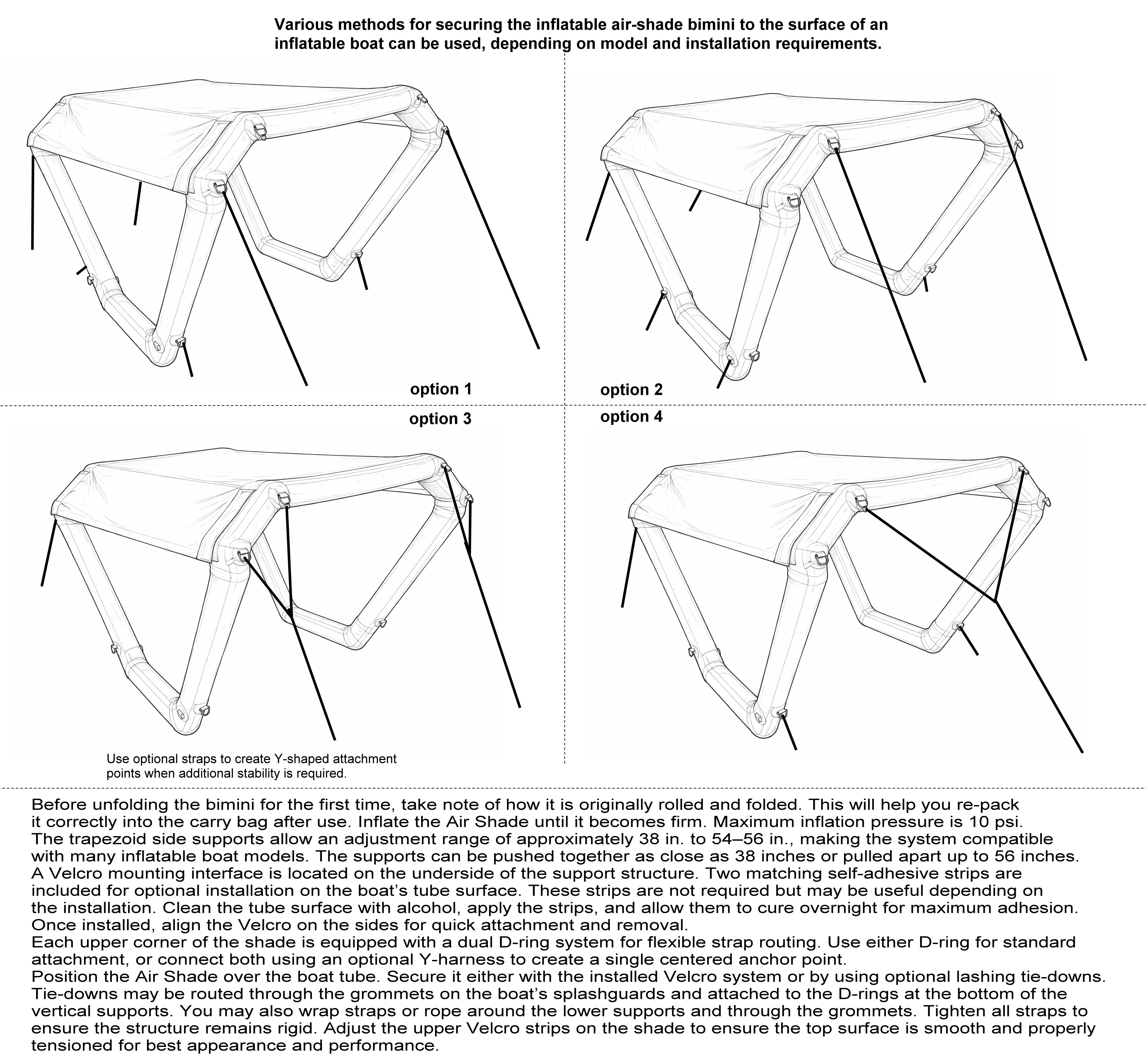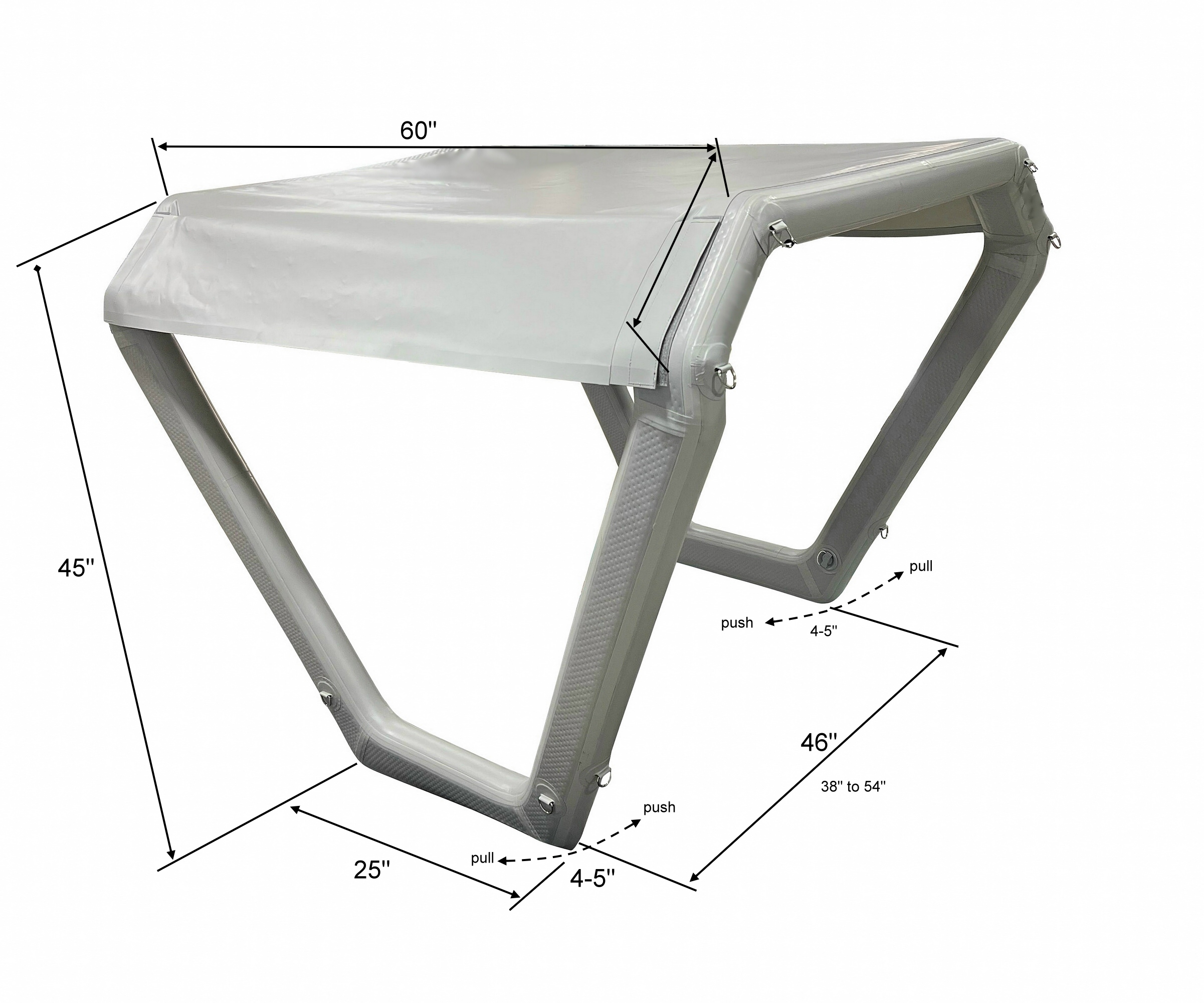 Built from durable 80mm drop-stitch material with heat-welded seams, the Air Shade is engineered for strength and long service life. It comes with four adjustable polyester straps and multiple D-rings, allowing quick and secure attachment to boat grommets or splash guards. For the best overall look and tension, the top includes four adjustable Velcro points that help distribute the fabric evenly and reduce sagging.
