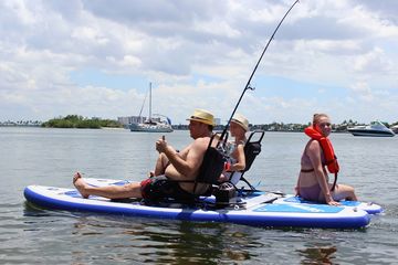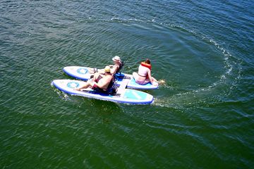 Unique product, designed to convert 2 inflatable stand up paddle boards into motorized catamaran. Separately, both high pressure inflatable boards can be use for stand up paddling for 2 people. Boards comes with D-rings on top, so that kayak seat or beach chair can be attached with tie downs, to use boards as a sit-n-top kayaks. Or, join both boards together using provided aluminum boards, and you have a catamaran for 2 people. Electric trolling motor can be installed on a transom that is mounted on one of benches. Place 2 beach chairs on top, and that makes perfect set for pleasure cruising or fishing.