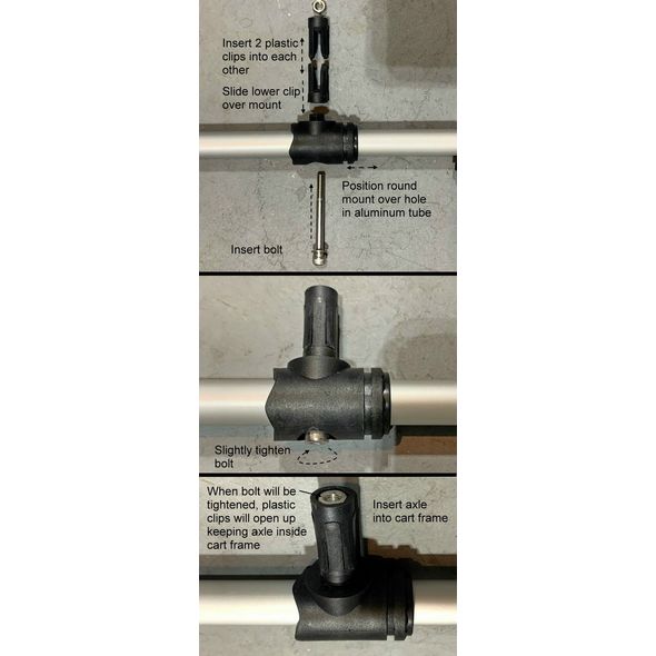 Answer: There are 2 hex screws inside black plastic inserts that goes into cart frame. Hex screw need to be properly tightened, so that to expand rubber seal inside cart frame tube. That will keep axle tube from falling out. Please download Assembly Manual.