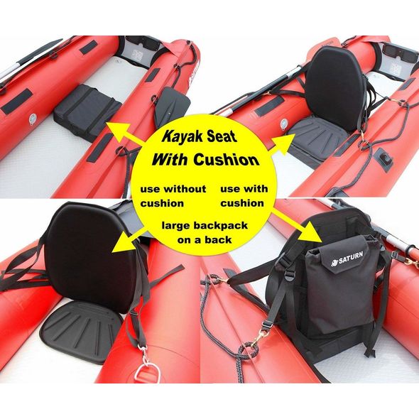 And now, we have new model in stock; kayak seat with a removable 2" thick, 14"x14" soft cushion, that can be used in multitudes of ways! It can be used to raise kayak seat up, for drier ride and more convenience. Saturn inflatable kayak OK420 with 2 kayak seats installed. Click to zoom in.Removable cushion can also be used on a beach for sitting on it, instead of sand or rocks. If other Personal Flotation Devices (PFDs) are not around, it can be used as a life-saving device in case of emergency, or as throwable PDF. Kayak seat attaches to the cushion with 2 Velcro strips. Cushion perfectly fit inside Saturn inflatable kayaks, kaboats and on top of Saturn inflatable paddle boards.