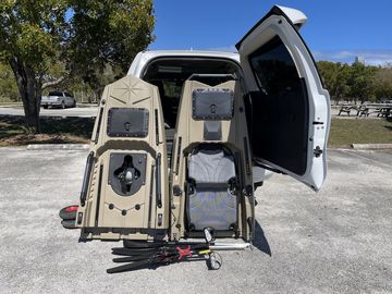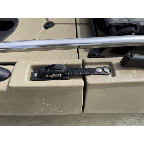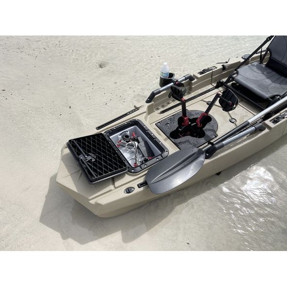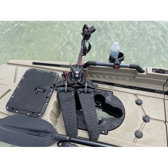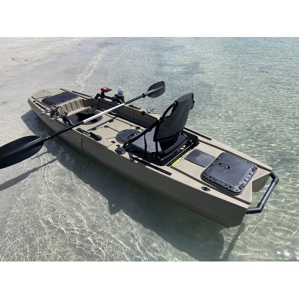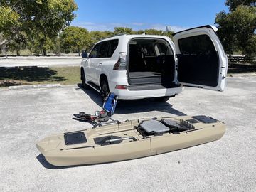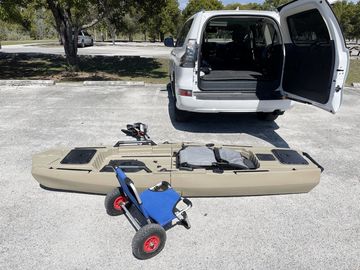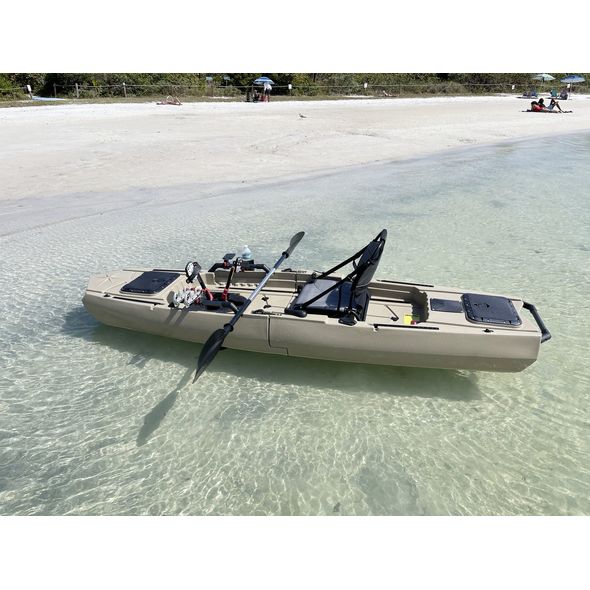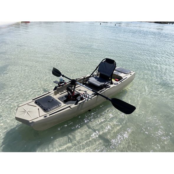 Comes with fin pedal drive, aluminum paddle, kayak chair, H-rails, cup holder, rod holders, fish finder mount and more. Complete set up ready for fishing. Kayak will fit into SUV, mini van and truck. Nice kayak, easy to assemble together, goes very smooth, but somewhat heavy. Kayak cart placed in a middle highly recommended.