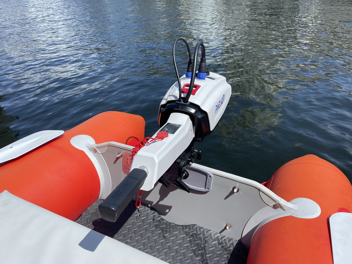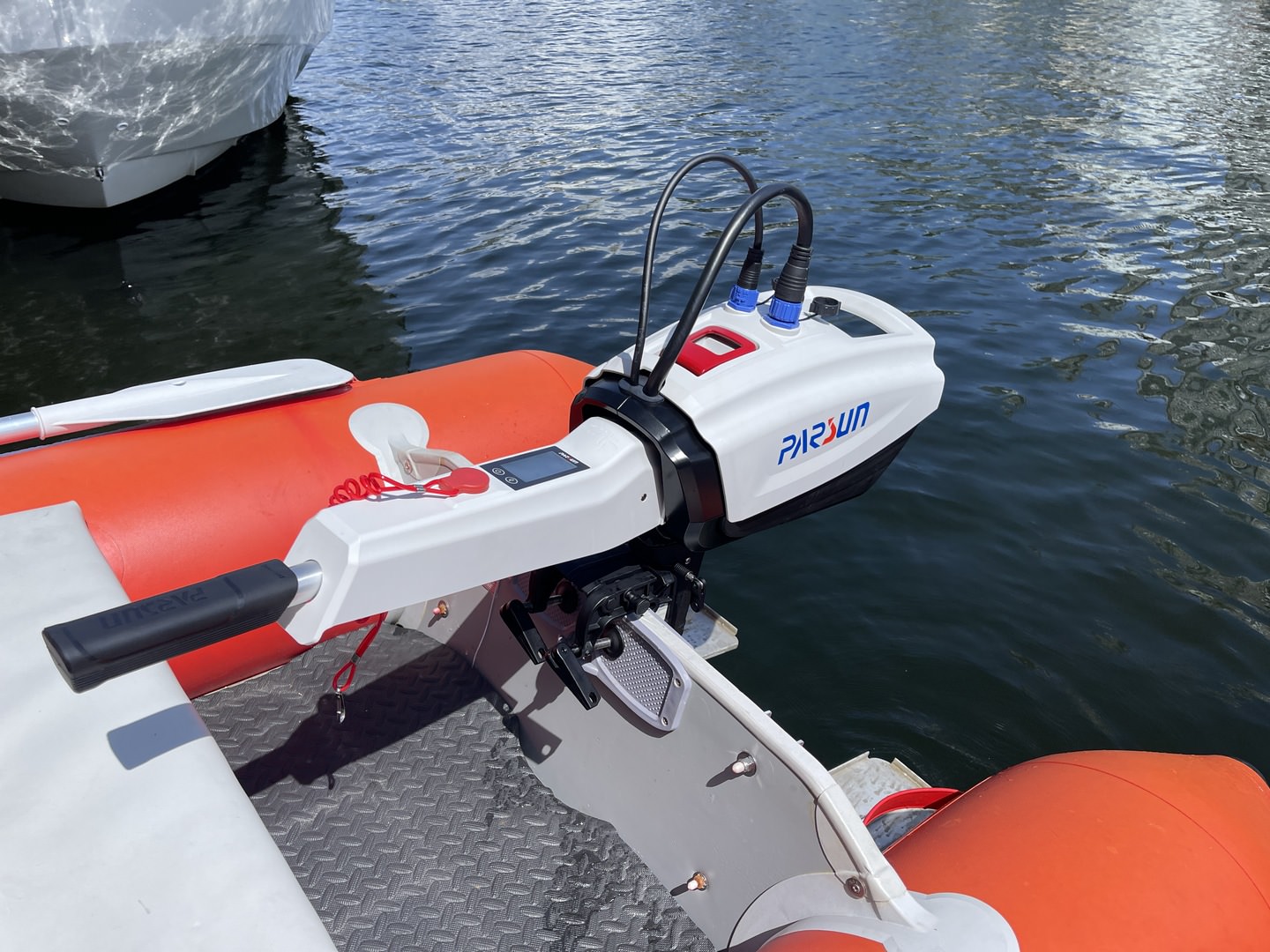 This is a portable 3HP electric outboard motor made for dinghies, inflatable boats, and KaBoats. It features a 1440Wh large integrated lithium battery for longer range. The outboard and battery are detachable and packaged independently, taking up minimal space and easy to transport.