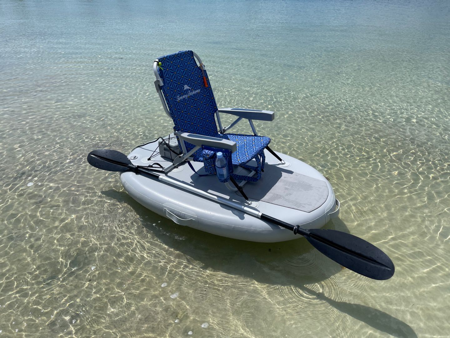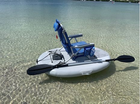 Included inflatable chair can be used separately for seating. Any type of beach chair can be installed on inflatable platform and secured with optional lashing tie downs. Island is overall pretty stable for person under 200lbs. It is easy to claim from shallows, sit back and relax.