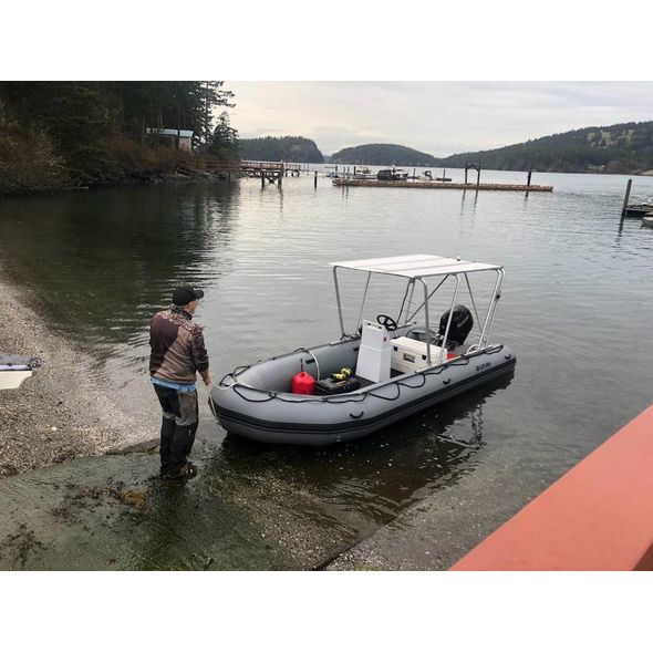Arch comes with mounting tubes that can be secured to splash guards on top of Saturn inflatable boats. Tubes can be either secured to grommet in splash guards with lashing tie downs, or 4 horizontal holes can be drilled in both tubes, and bolts or thumb bolts can be used to secure mounting tubes directly to grommet holes in splash guards using 2 bolts on each tube. Arch can also be mounted on a non-inflatable boat without side mounting tubes, by drilling holes to install arch hardware directly to hard hull of boat.