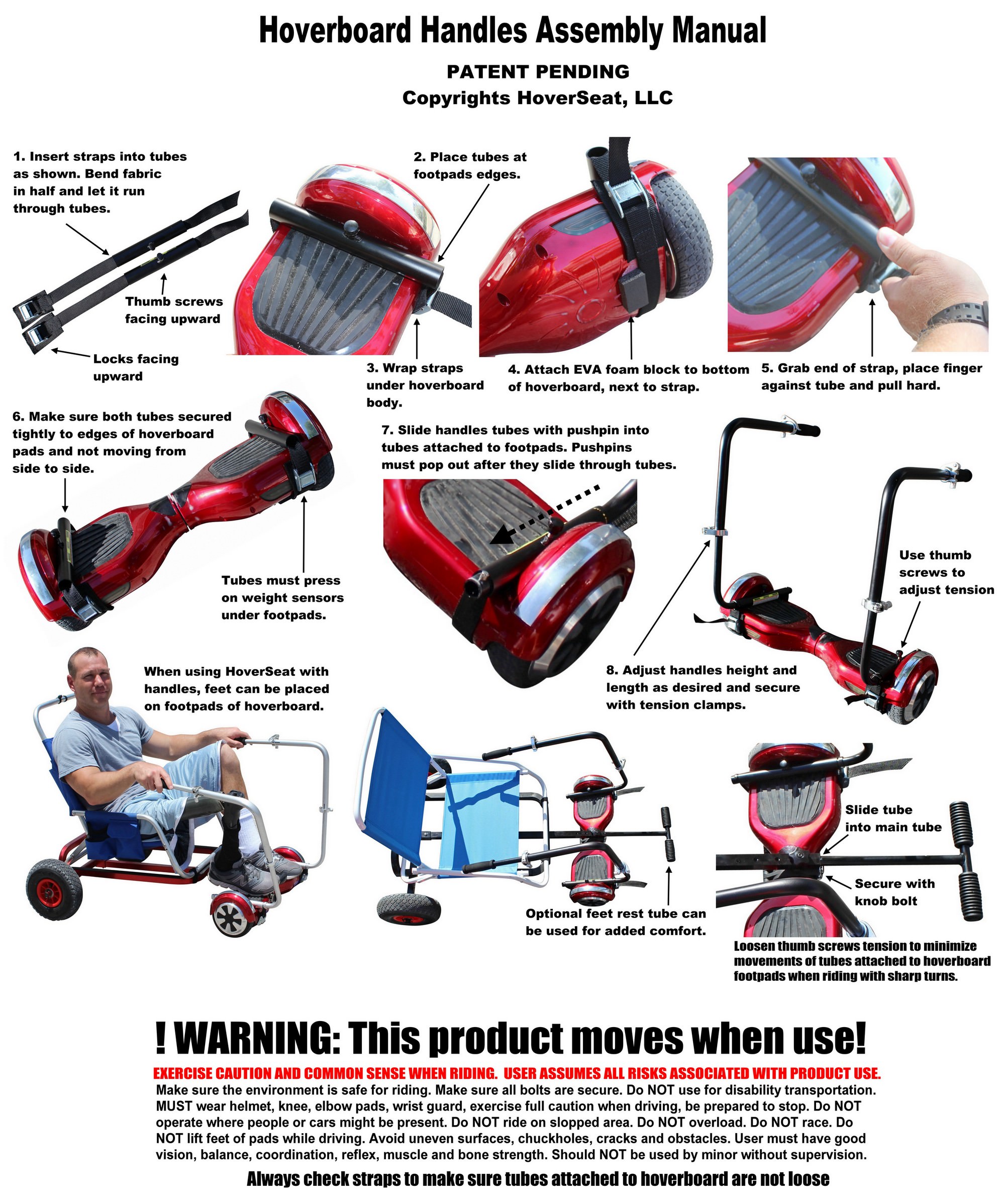 A. The HoverSeat product includes: aluminum frame that requires simple assembly, two pneumatic wheels, plastic clamp that secures to the middle of the hoverboard, two Velcro tie downs and a product manual. Also included as a free bonus is one plastic T-handle that can be installed in order to provide an additional option for pulling a cart by hand, if needed. Depending on the time of production there might be a pre-installed rubber layer on top of the frame, or rubber self-adhesive tape might be provided as an option to attach on top of the HoverSeat frame as needed.