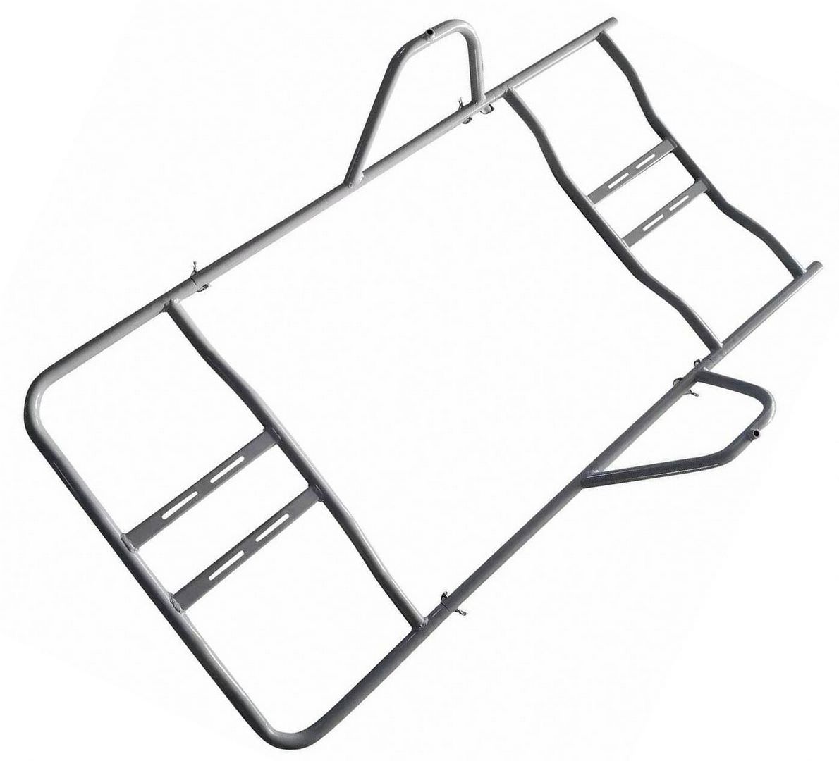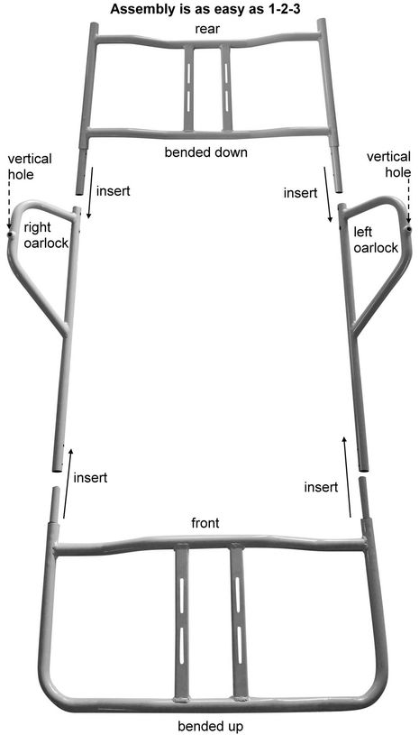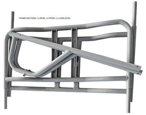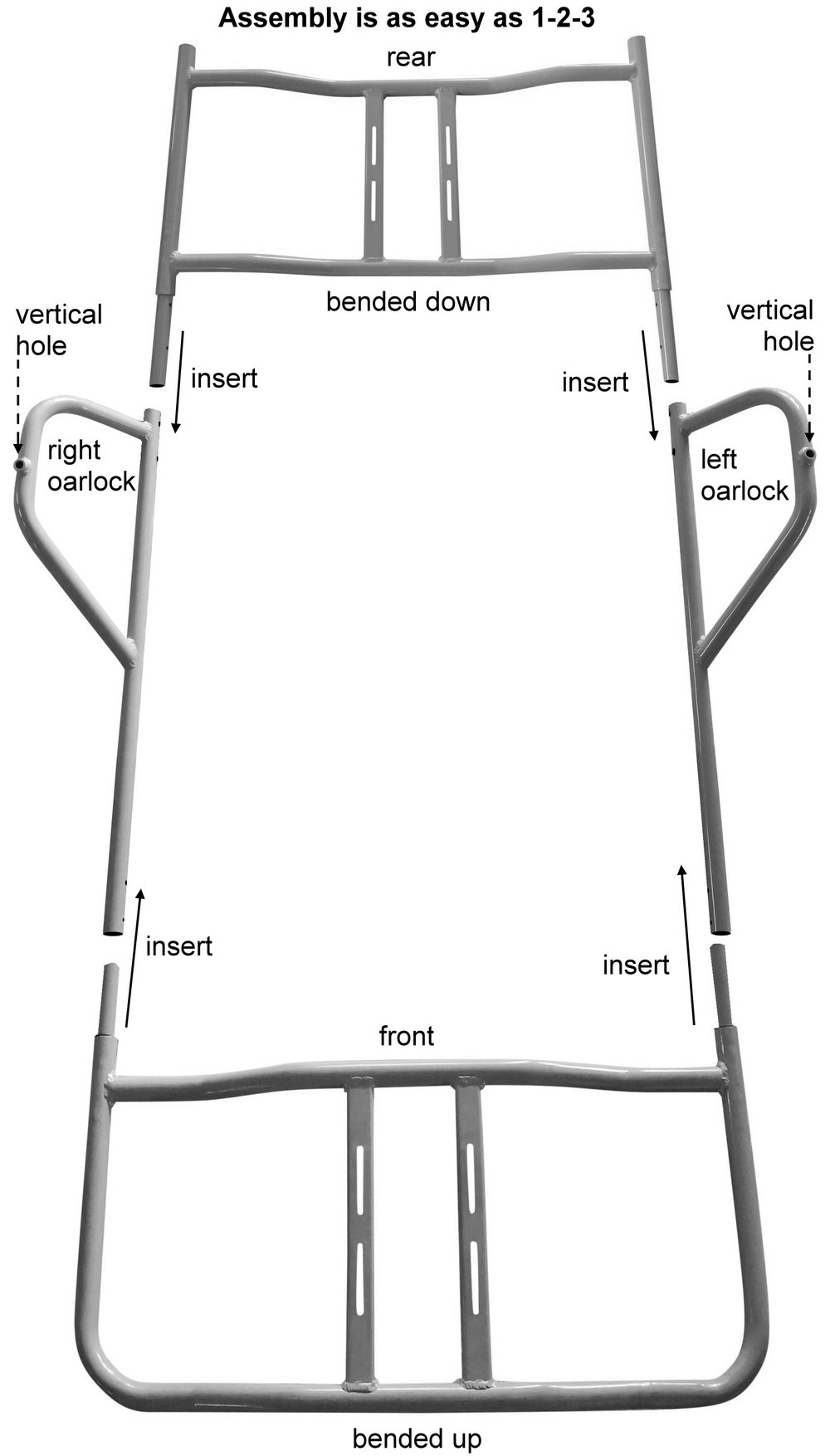 Folding frame made of heavy duty, rust resistant anodized aluminum. Can be disassembled for easy storage and portable transportation. To use this frame you will need following optional accessories (not sold by BoatsToGo.com): seat of adjustable straps to secure frame to at least 4 attachment points, rowing oars, oarlocks, swivel base and fishing chair.