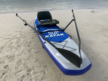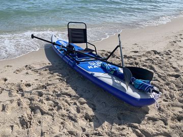 Our new add-on rowing frame for SUP paddle boards, can also be installed on small river rafts, kayaks and narrow KaBoats. It is simple, easy to assemble H frame, with 2 sturdy rowing arms and oarlocks. Rowing frame can be attached to paddle boards, rafts, kayaks and KaBoats with optional tie downs, secured to D-rings or seat straps. If no attachment points exists, such as with regular hard body non-inflatable paddle boards, then optional tie down lashing straps can be run under hull of vessel, to press frame against its top surface.