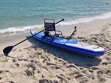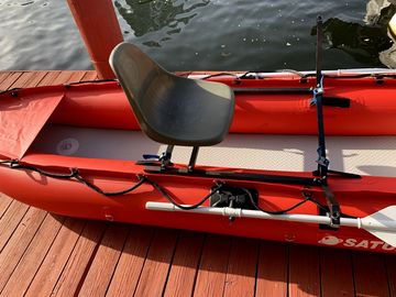 There are 2 seating options available with rowing frame. Either $10 Walmart low profile sand beach chair, placed on top of paddle board, and secured with optional tie downs. Or, fishing seat bolted to the top of frame, with or without swivel and quick disconnect. Top of frame has 4 holes, designed to match holes on bottom of folding fishing seats or casting seats. Folding fishing or casting seats can be purchased on Amazon or local Walmart. Optional swivel platform or quick disconnect can be used to have seat rotate on top of rowing frame or quickly removed.