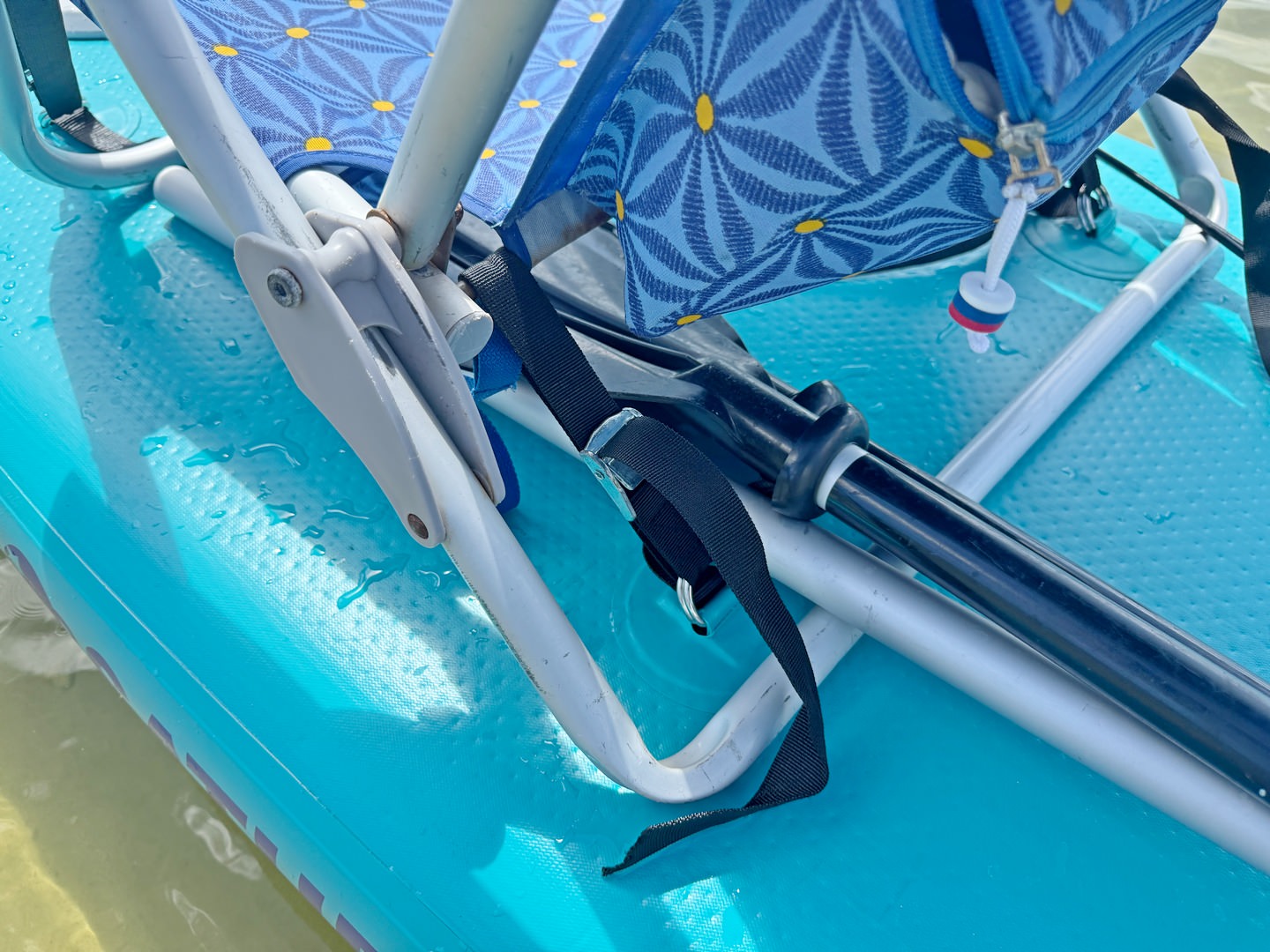 Its sleek, streamlined shape slices through the water with minimal resistance, letting you glide effortlessly at speeds of 3–4 mph. The included fin pedal drive delivers smooth, efficient propulsion, while the secure four D-ring chair system makes it compatible with most standard beach chairs from popular retailers.
