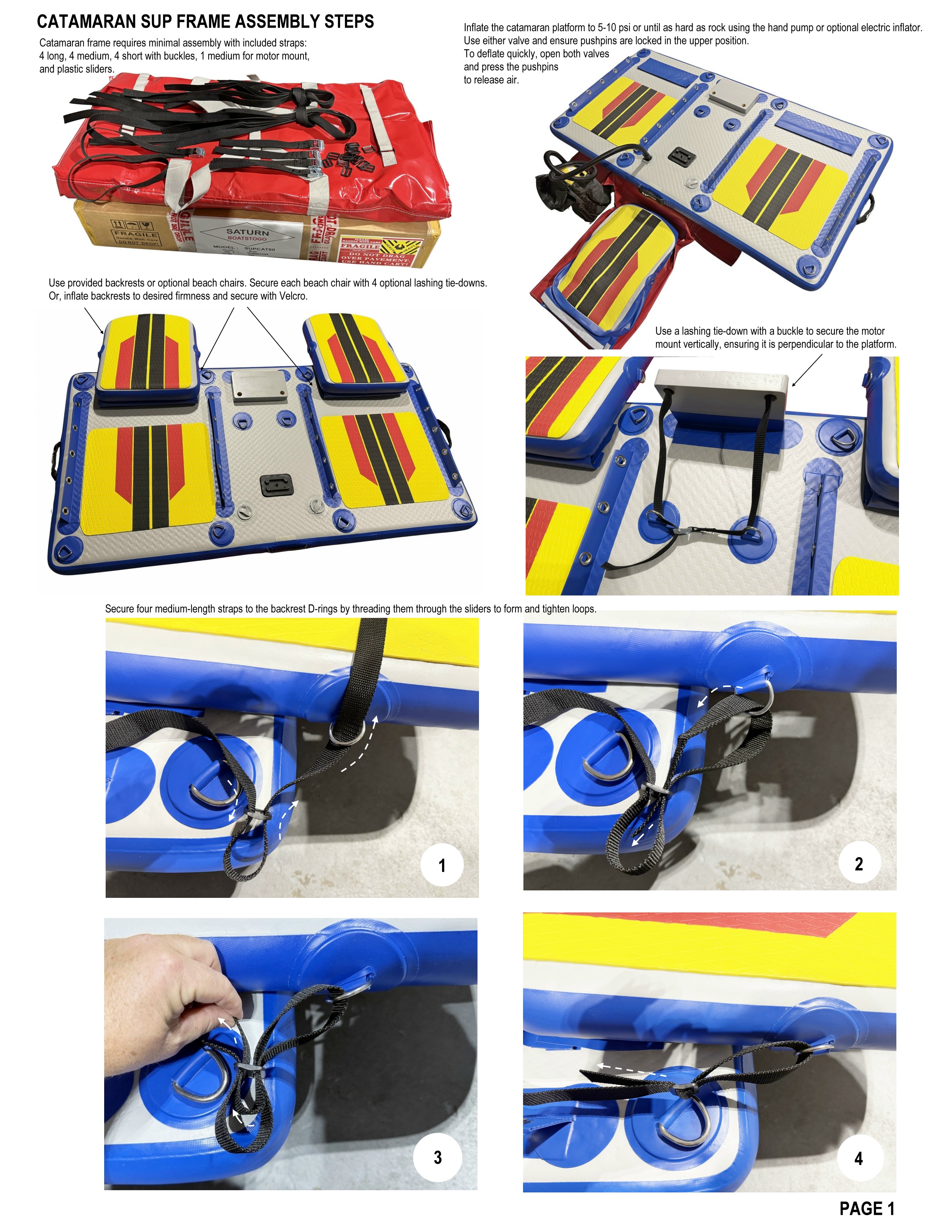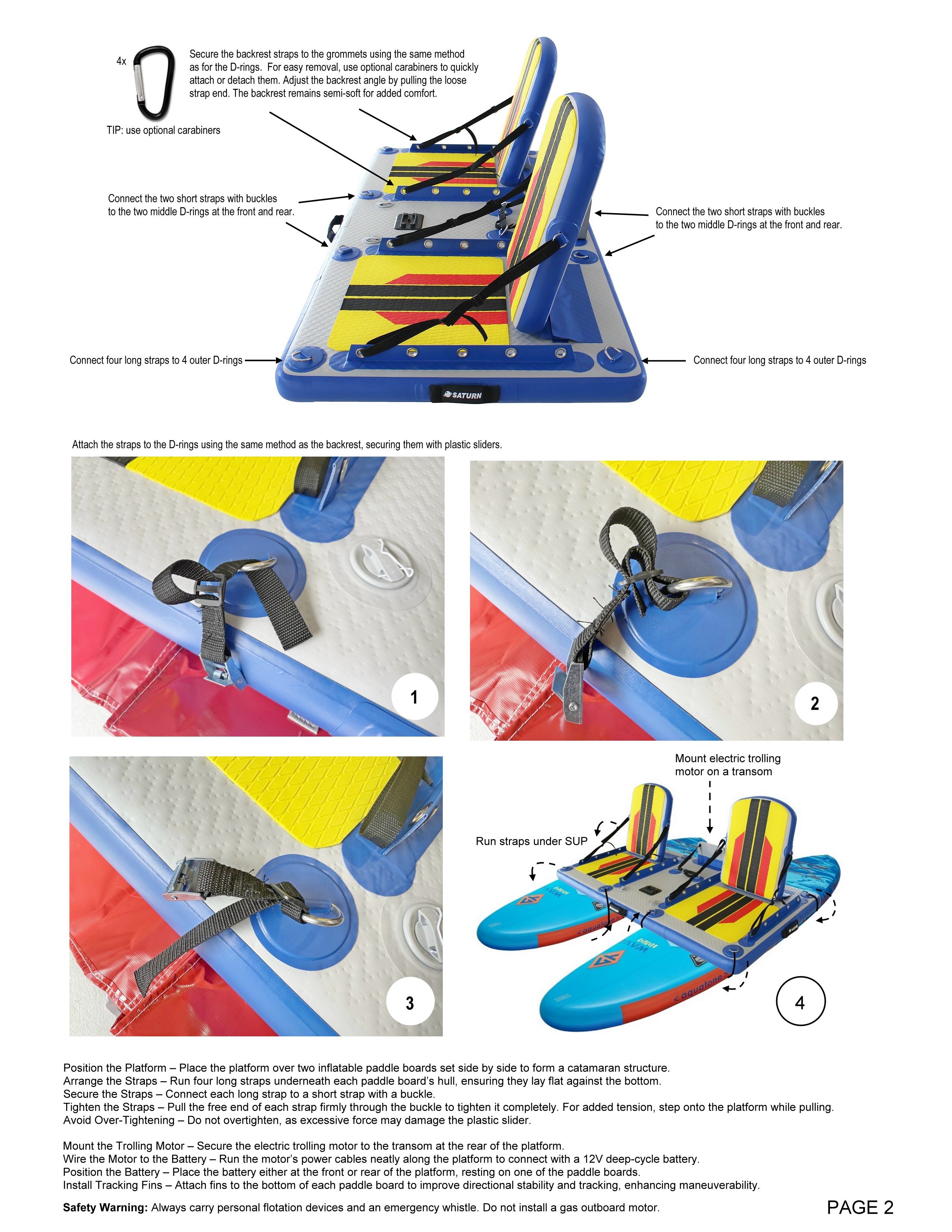 Secure Attachment: The platform attaches to the paddle boards using provided tie-down straps, which run under the hulls and secure to D-rings on the platform.